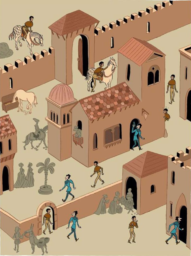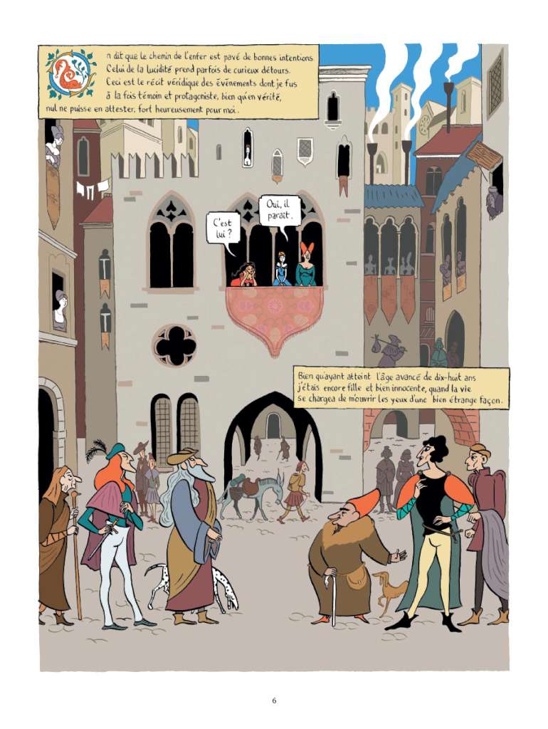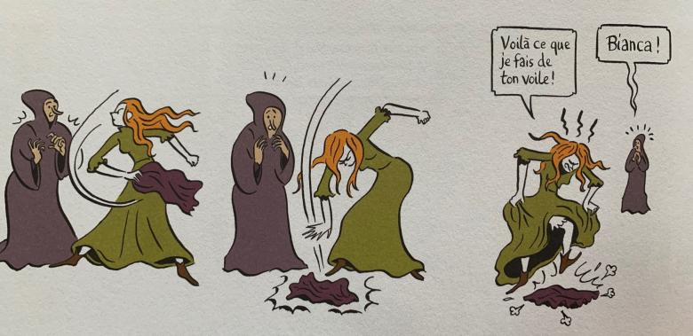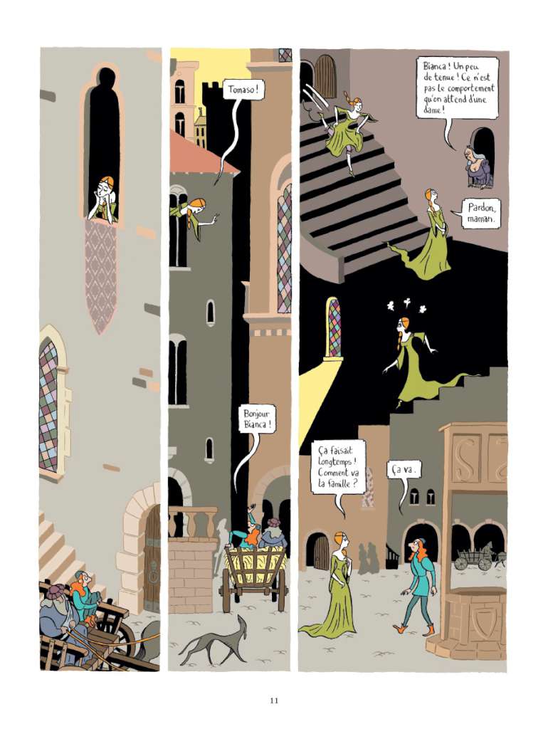Le dessin coloré de Zanzim, faussement naïf, est à l’avenant : les héros sont très reconnaissables ( le nez de Giovanni, les grands yeux bleus de Bianca qui permettent de la retrouver aussi sous les traits de Lorenzo, la silhouette tout en raideur et les yeux noirs de Fra Angelo…) ; les décors sont épurés, les personnages cernés de noir dans la tradition de la ligne claire ; les visages – sans être caricaturaux – sont très expressifs et les sentiments sont souvent exprimés à l’aide de codes graphiques comme des petits tourbillons pour marquer l’émoi ou des nuages noirs pour signifier la colère. L’ensemble est d’une grande lisibilité.