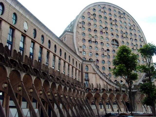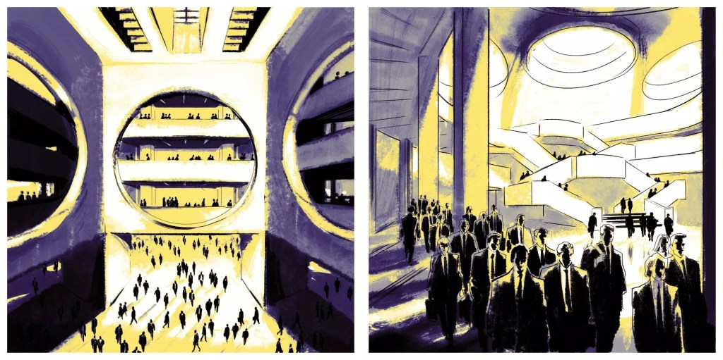 La dimension déshumanisante de l’univers dans lequel évolue le héros est également remarquablement illustrée par les graphismes géométriques extrêmement rigoureux et désincarnés et les jeux de perspective. Les hommes représentés avec un trait « jeté » sont souvent dépourvus de visage, comme anonymes et invisibilisés. Ils sont perdus dans cet univers à la fois bétonné (d’où émergent les symboles de l’état : les trois pyramides des ministères) et détruit puisqu’Orwell s’inspirait pour son décor du Londres d’après le Blitz. Cette atmosphère délétère est renforcée par le choix de bâtiments au style architectural bien précis : des références au « Métropolis » de Fritz Lang certes mais également à des lieux bien réels : la bibliothèque Philips de Louis Kahn à Exeter dans le New-Jersey , le musée Whitney de Marcel Breuer à New-York, le quartier de la Défense ou encore le palais de justice de Créteil de Daniel Badani, les « camemberts » de Manuel Núñez Yanowsky ou les espaces d’Abraxas de Ricardo Bofill à Noisy le Grand où furent tournés des scènes des films et séries dystopiques « Brazil », « Hunger Games » et « Tripalium ». Dans cet univers architectural brutaliste, tout de béton, Coste joue avec les rapports d’échelle et les angles de prise de vue : les immenses bâtiments monolithiques présentés en contre plongée écrasent les personnages.