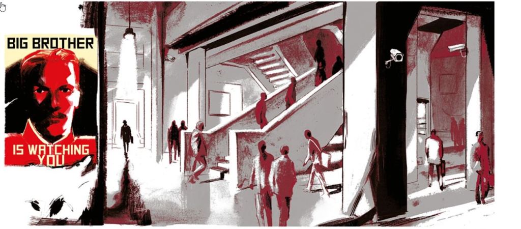 Ce roman d’Orwell entre étrangement en résonnance avec l’époque actuelle : les éléments de langage, la géolocalisation, les caméras de vidéosurveillance, l’hégémonie des écrans dans nos vies, les fake news … Ses ventes se sont envolées au moment de l’élection de Donald Trump et ce n’est pas un hasard … La crise sanitaire a renforcé ce sentiment d’œuvre prémonitoire avec l’interdiction de dépasser les 100 kms et Xavier Coste a choisi de dresser des parallèles avec notre univers contemporain.