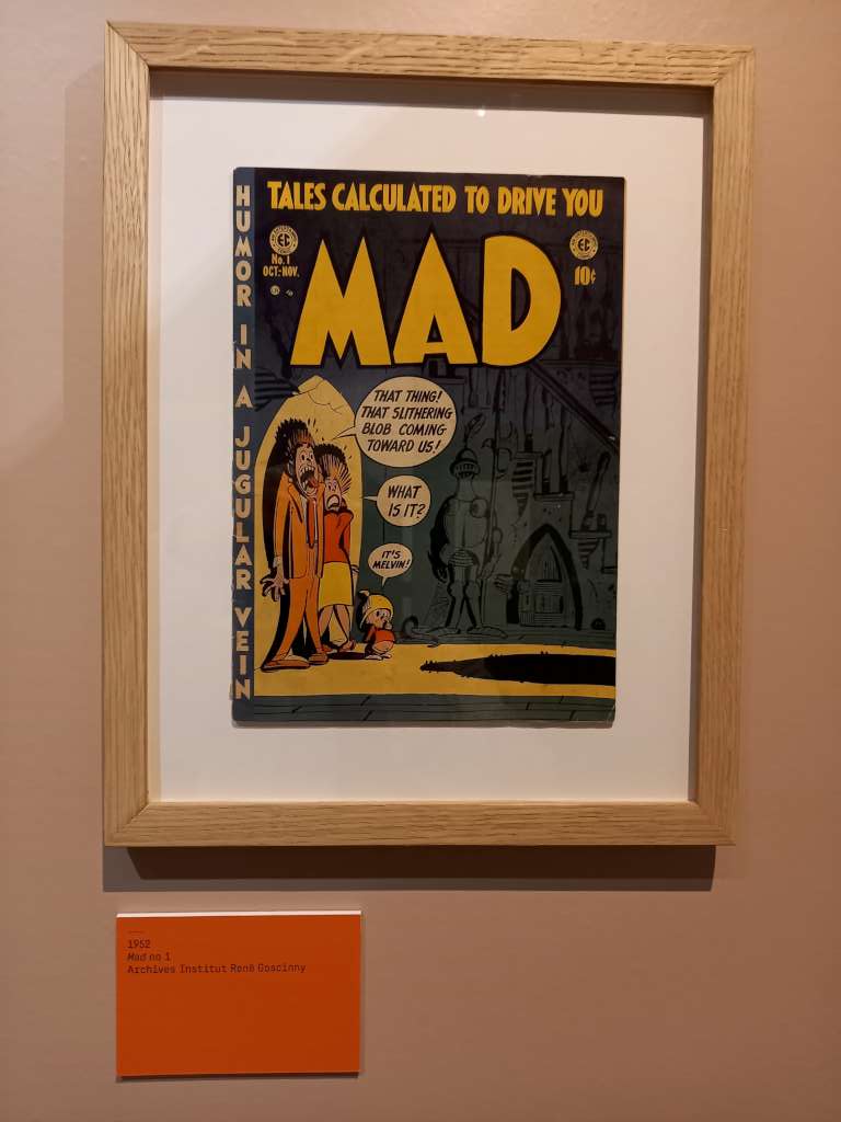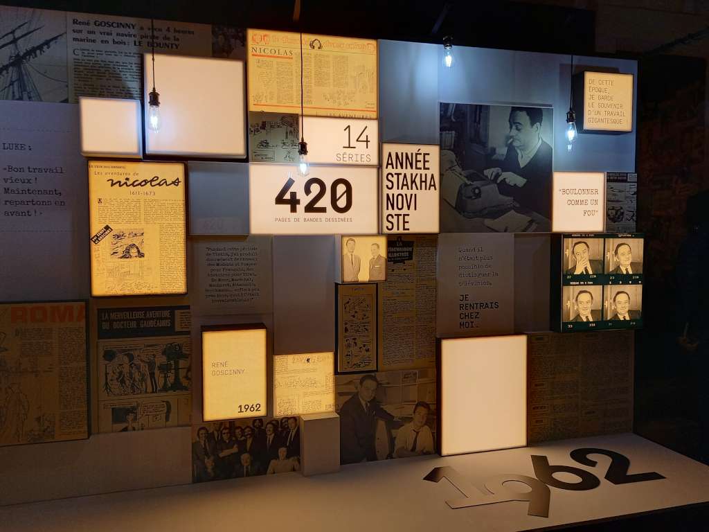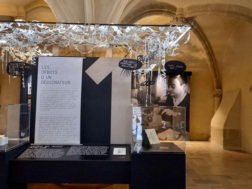 Dotée d’une superbe scénographie inventive du sol au plafond, l’expo nous plonge en immersion dans l’univers goscinnien et sous des nuages de mots et d’onomatopées en papier découpé suspendus, foulant les bulles aux dialogues mythiques, nous déambulons à la rencontre des différents personnages nés de l’imagination fertile de ce scénariste prolifique qui au cours de deux décennies a conçu plus de 450 scénarios de bande dessinée.