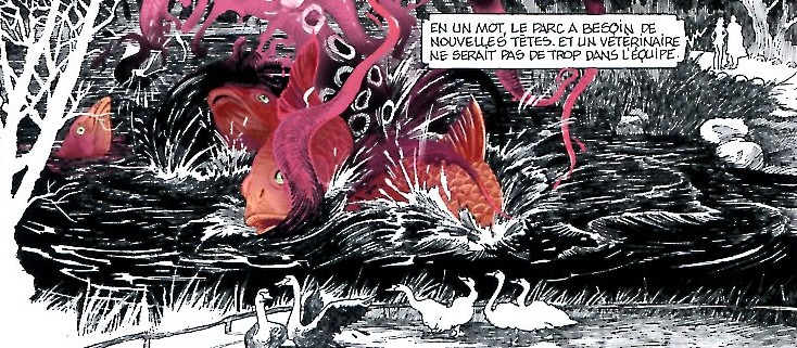 Pour la constitution du bestiaire, l’auteure a fait se rencontrer les poulpes géants et autres créatures de l’univers de Lovecraft et les cygnes, carpes et autres créatures habituelles d’un jardin public.