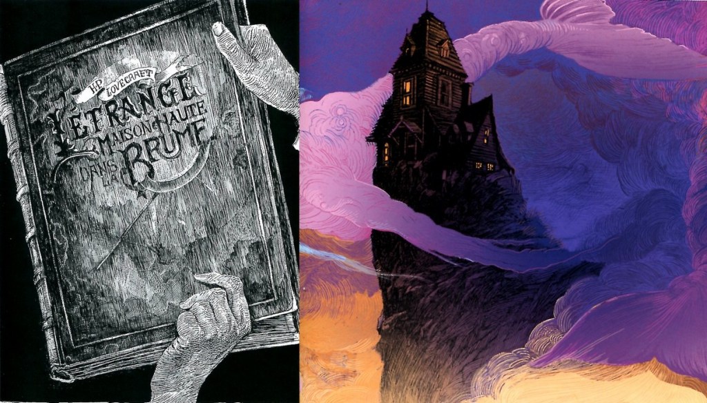 Même si l’album contient le texte intégral d’une nouvelle de Lovecraft « L’étrange maison haute dans la brume », « Le bestiaire du crépuscule« , n’est pas une adaptation. Daria Schmitt s’est inspirée de la vie plutôt que de l’œuvre de Lovecraft. Ce n’est pas non plus une biographie mais plutôt une évocation de son monde intérieur, de son univers onirique et poétique. Aussi dans l’illustration de la nouvelle, retrouve-t-on des éléments qui apportent un éclairage sur l’intrigue de la bande dessinée. Et c’est uniquement le dessin qui fait le lien entre ces deux mondes qui vont s’entrelacer.