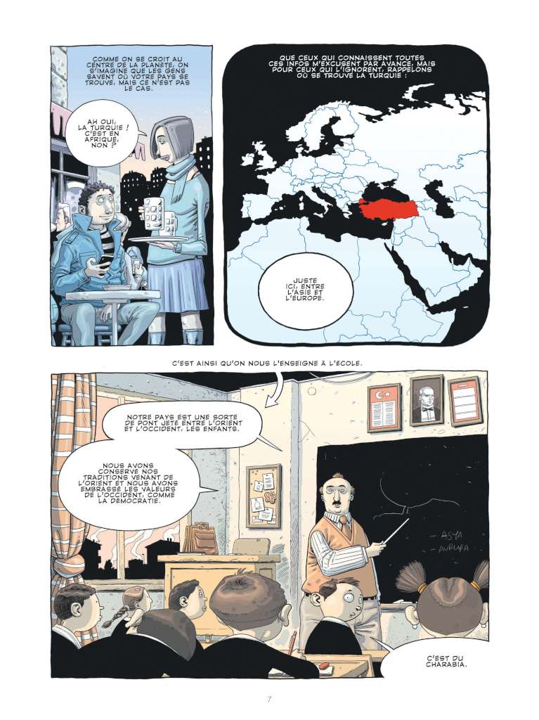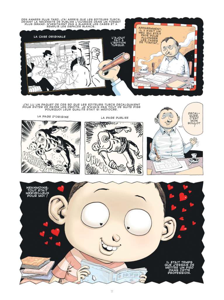 Outre l’histoire et la politique, la lecture de cet opus nous éclaire sur la place de la bande dessinée et la presse satirique en Turquie. Le petit Ersin a découvert la bande dessinée franco belge à travers des ouvrages souvent décalqués et dans lesquels, format oblige, on n’hésitait pas à prolonger certaines cases. Étonnant ! La bd était très prisée dans les cours de récréation mais là aussi il y a de quoi être surpris.