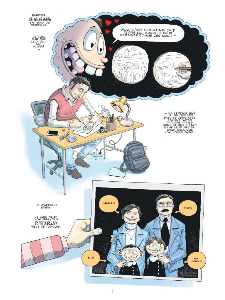 Né en 1981, le petit Ersin grandit dans une banlieue défavorisée d’Istanbul entre deux parents enseignants laïcs, ouverts à la culture occidentale. Qu’est-ce qui passionne l’enfant ? Le dessin. Il faut dire qu’il a sous les yeux l’exemple d’un père qui, le soir, pour boucler ses fins de mois, quitte son habit d’enseignant pour enfiler celui de peintre amateur. De là à s’imaginer que toutes les personnes qu’il croise se penchent sur leur table de dessin une fois rentrés chez eux, il n’y a qu’un pas. Ajoutez à cela que, sur la table du salon, feuilles, crayons, pinceaux lui tendent les bras. Alors, donnant vie à des super-héros de son invention l’homme-lang, l’homme-grenouil, l’homme-cigogne, Ersin se rêve dessinateur.