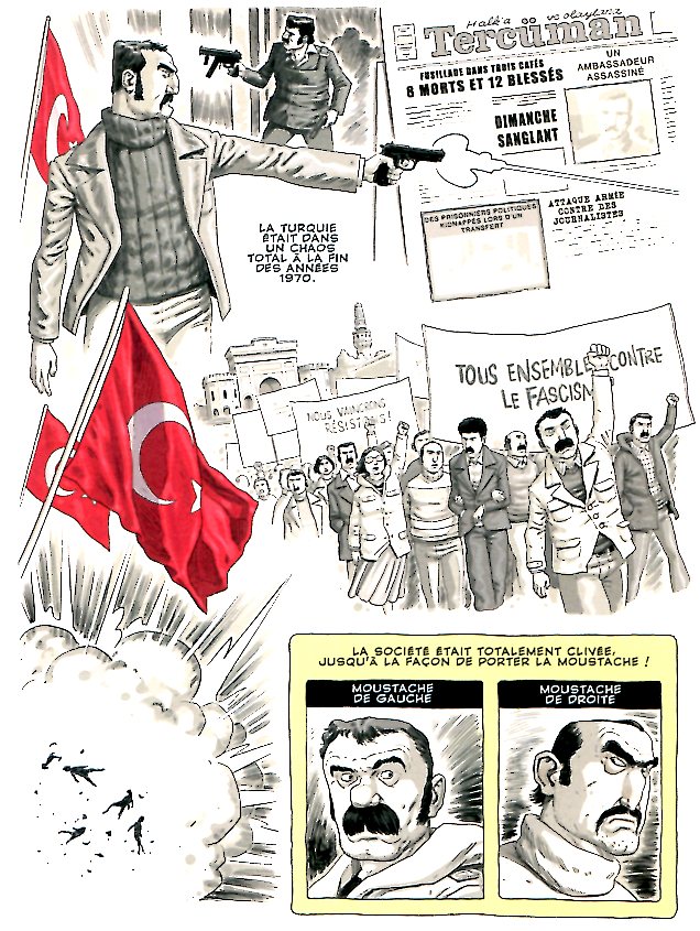 L’auteur qui a grandi avec Tintin et Obélix, a découvert les comics underground américains, et s’est plongé avec délectation dans les magazines satiriques turcs. Cette triple influence se retrouve dans ses dessins.