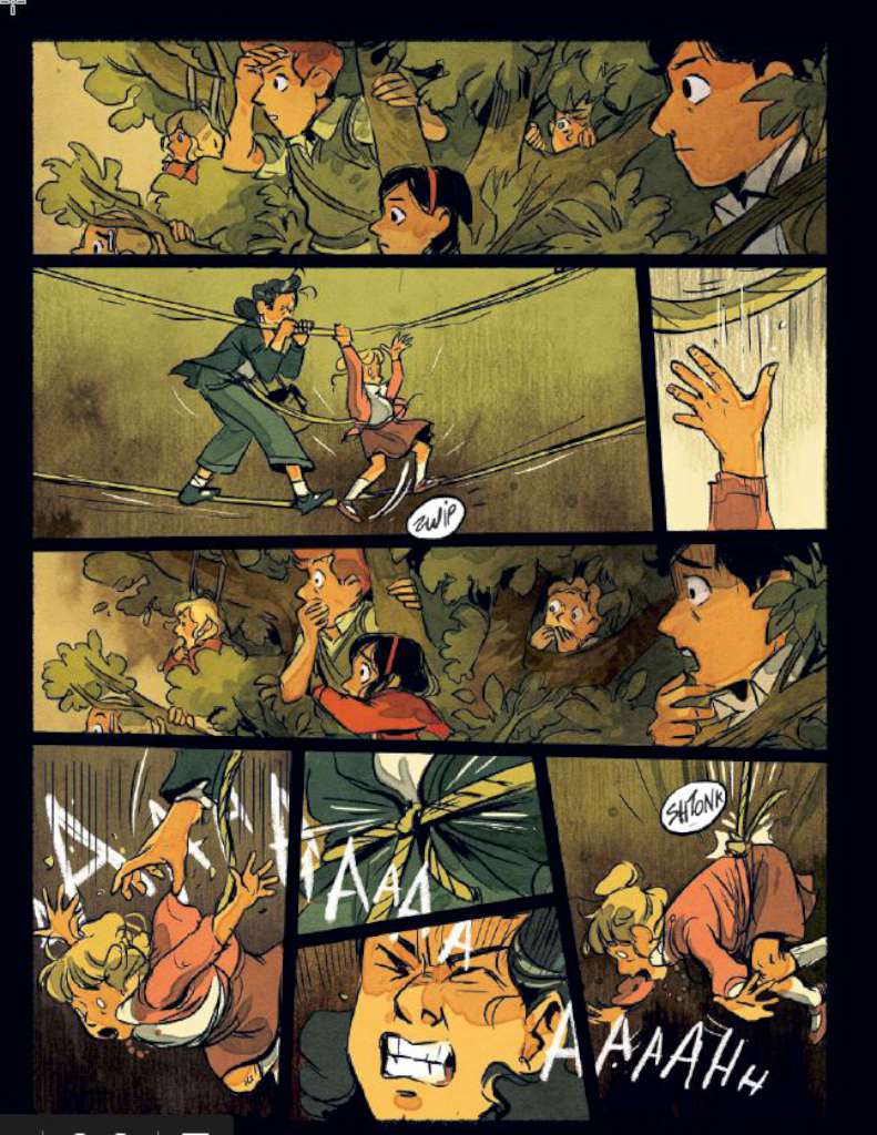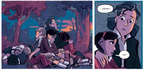 Quant au dessin, il est aussi renouvelé. Comme dans « Collaboration Horizontale », ou « Nellie Bly », Carole Maurel joue parfois du symbole mais on a cette fois un petit côté manga qui n’apparaissait pas auparavant. En plus des personnages cadrés de très près et de la focalisation sur leurs yeux, on trouve en effet dans « Les Enfants de Surcouf » certaines pages cernées de noir (comme les comics) ; certaines vignettes deviennent triangulaires ou octogonales comme dans la bande dessinée japonaise et les onomatopées font partie intégrante de la composition de l’image. Mais surtout la dessinatrice, à l’aide de sa palette graphique et de ses brushes qui ont parfois un rendu d’aquarelle, délivre des pages plus organiques que dans ses œuvres précédentes. La majeure partie de l’action de ce tome se passe dans la forêt, souvent de nuit et on a donc une grande variété de couleurs et de textures pour recréer décors et ambiances. Les pleines pages sont plus nombreuses aussi ce qui permet de créer une respiration dans la narration et de donner à la bédéaste la possibilité de faire éclater son talent.