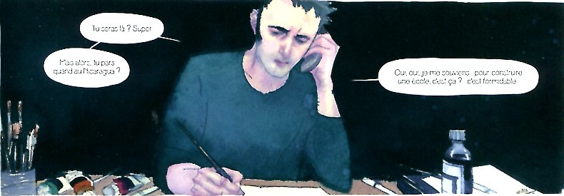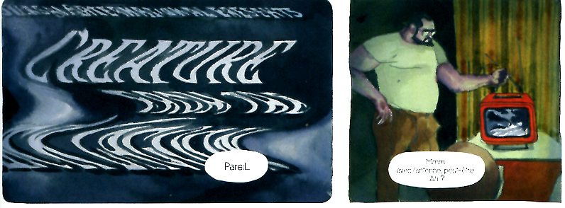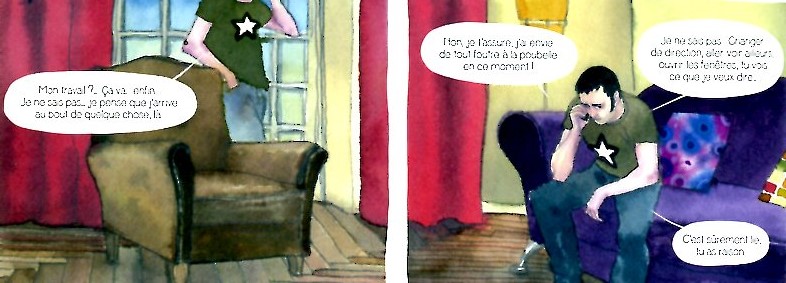 Après un au revoir à ses grands parents qui sonne comme un au revoir à son enfance, nous passons à la seconde partie du récit, celle de ses débuts de dessinateur à la fois auteur de bandes dessinées et illustrateur jeunesse. Les années collège et lycée sont expédiées en deux planches et c’est le jeune adulte qui vient d’intégrer la prestigieuse école Émile Cohl qui va poursuivre le récit. Bien des choses ont changé depuis l’enfance : le divorce de ses parents, la dépression de son père vont assombrir les années à venir. Aussi ses premières œuvres vont-elles traduire son côté sombre jusqu’à la parution de l’album jeunesse « La colère de Banshee » qui marquera graphiquement sa sortie du tunnel et son œuvre future. Exit les clairs-obscurs de Don Quichotte et place aux grands aplats de couleurs très lumineux sans l’ombre d’une ombre.
