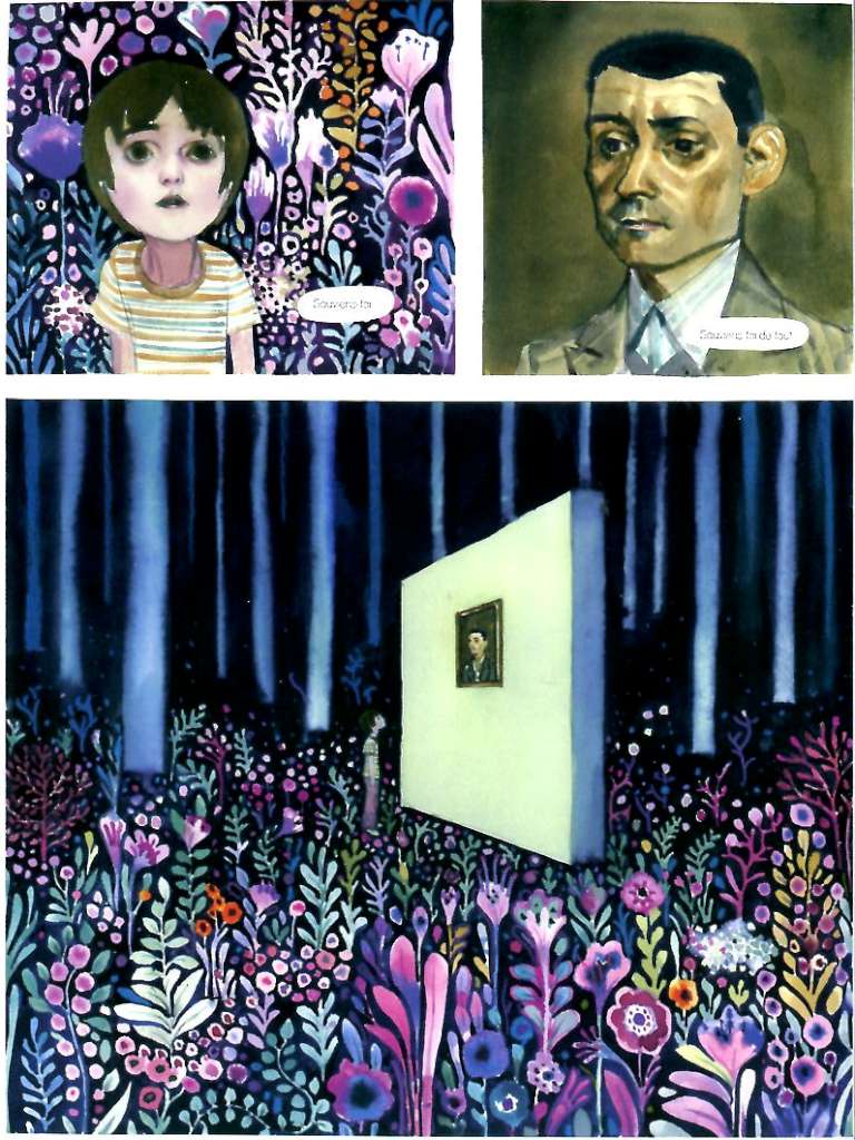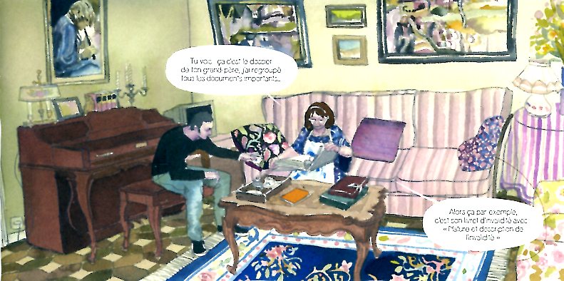 Pour la scène d’introduction de son grand-père fuyant l’Espagne, il le brosse en héros cavalant dans le ciel avec des pastels très colorés. Alors on pense à Chagall, bien sûr mais d’autres influences très variées se font sentir tout au long de l’album : Franz Marc, Emil Nolde, David Hockey, Norman Rockwell aussi pour les scènes d’intérieur …