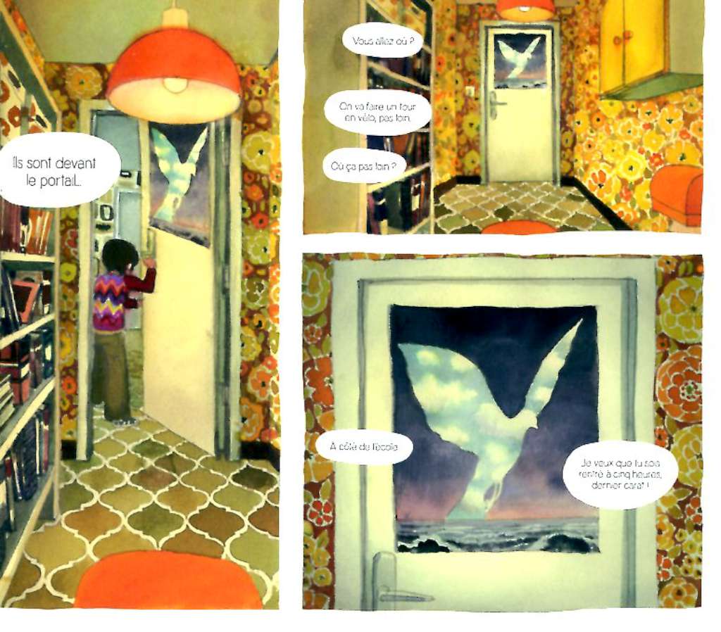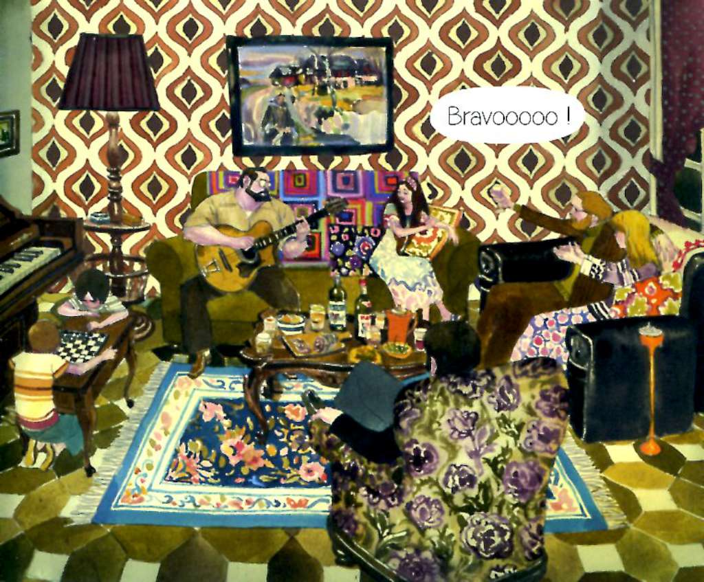 Et puis cerise sur le gâteau, il nous peint un tableau extrêmement fidèle de l’esthétique de ces années-là où la sobriété n’était pas de mise, depuis la tenue vestimentaire avec les emblématiques pulls jacquard jusqu’à la déco inénarrable avec ses papiers peints psychédéliques à grosses fleurs ou motifs géométriques dans les tons jaune, orange, marron … Toute une époque ! Un vrai régal, une madeleine de Proust pour ceux qui, comme moi, l’ont connue !