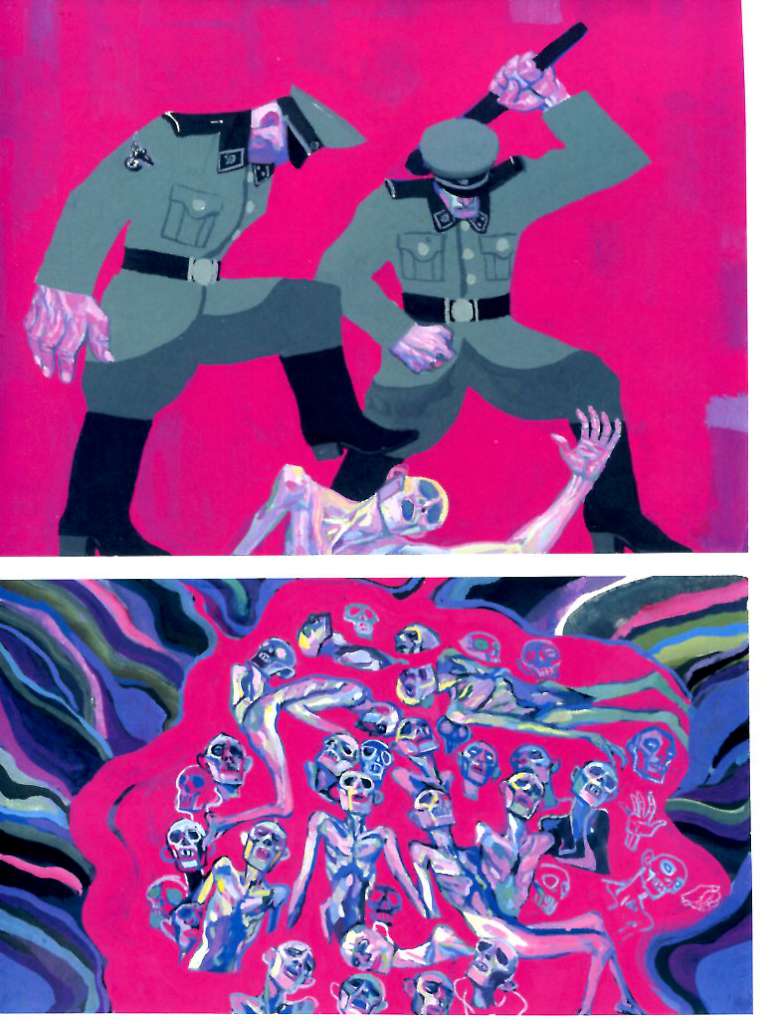 Cet album est un véritable choc graphique dans lequel l’artiste varie les techniques, aquarelle, gouache, pastels, lavis pour être au plus près de la représentation mentale et du ressenti du petit garçon qu’il était et être vrai dans l’émotion en mettant en œuvre avec talent son savoir-faire d’illustrateur jeunesse. On passe du net au flou avec des effets de sfumato suivant les fluctuations de la mémoire. Si le récit principal est réalisé à l’aquarelle, l’utilisation de la gouache et des couleurs pures très vives sans tracé préalable pour les scènes de camp n’en fait d’autant mieux ressortir la violence, l’humiliation subie, l’horreur.