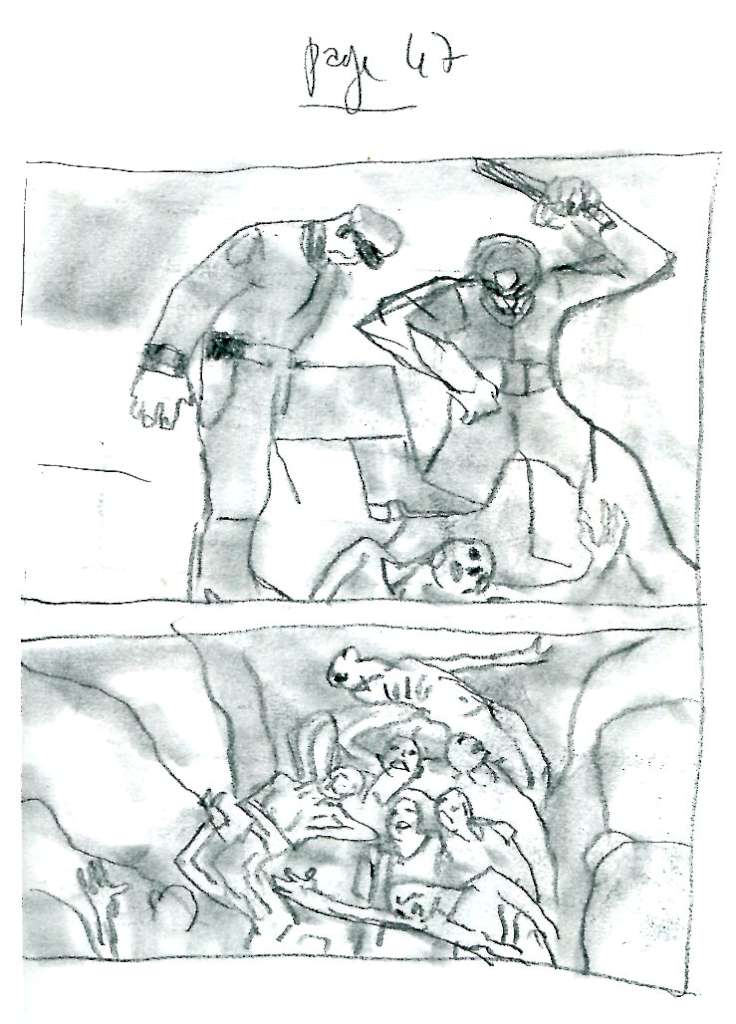 Les deux premiers tiers de l’album sont consacrés à ses souvenirs d’enfance et l’histoire de ses grands-pères donc, tous deux combattants républicains espagnols, réfugiés en France lors de la victoire de Franco et internés au camp d’Argelès-sur-Mer. Sur la couverture, on découvre le portrait d’un homme, portrait dont on apprendra l’incroyable histoire, qu’on retrouvera accroché dans le salon familial et reviendra tel un leitmotiv tout au long l’album. Ce portrait, c’est celui de son grand-père maternel Antonio Soto de Torrado, condamné à mort par Franco, incorporé dans l’armée française, fait prisonnier par les Allemands à Dunkerque et déporté à Mauthausen de 1941 à 1945 et c’est à travers lui que s’ouvre le récit. En clôture de ces 110 pages consacrées à l’enfance, viendra l’histoire de Josep Sala, son autre grand-père, qui ayant réussi à s’échapper du camp d’Argelès, combattra dans le maquis, frôlera lui aussi la mort à laquelle il échappera miraculeusement.