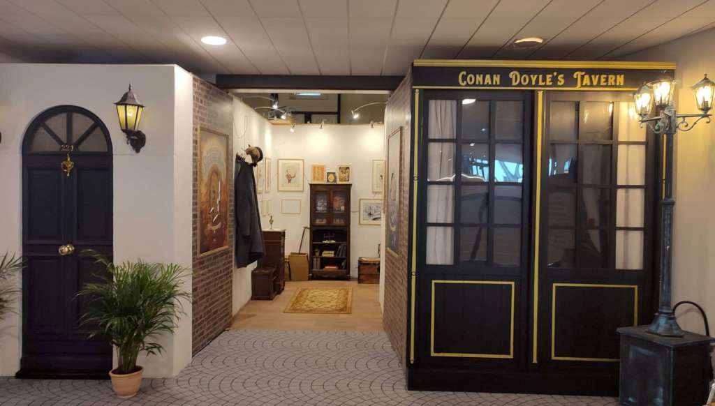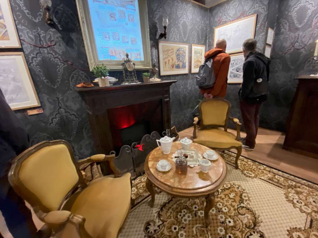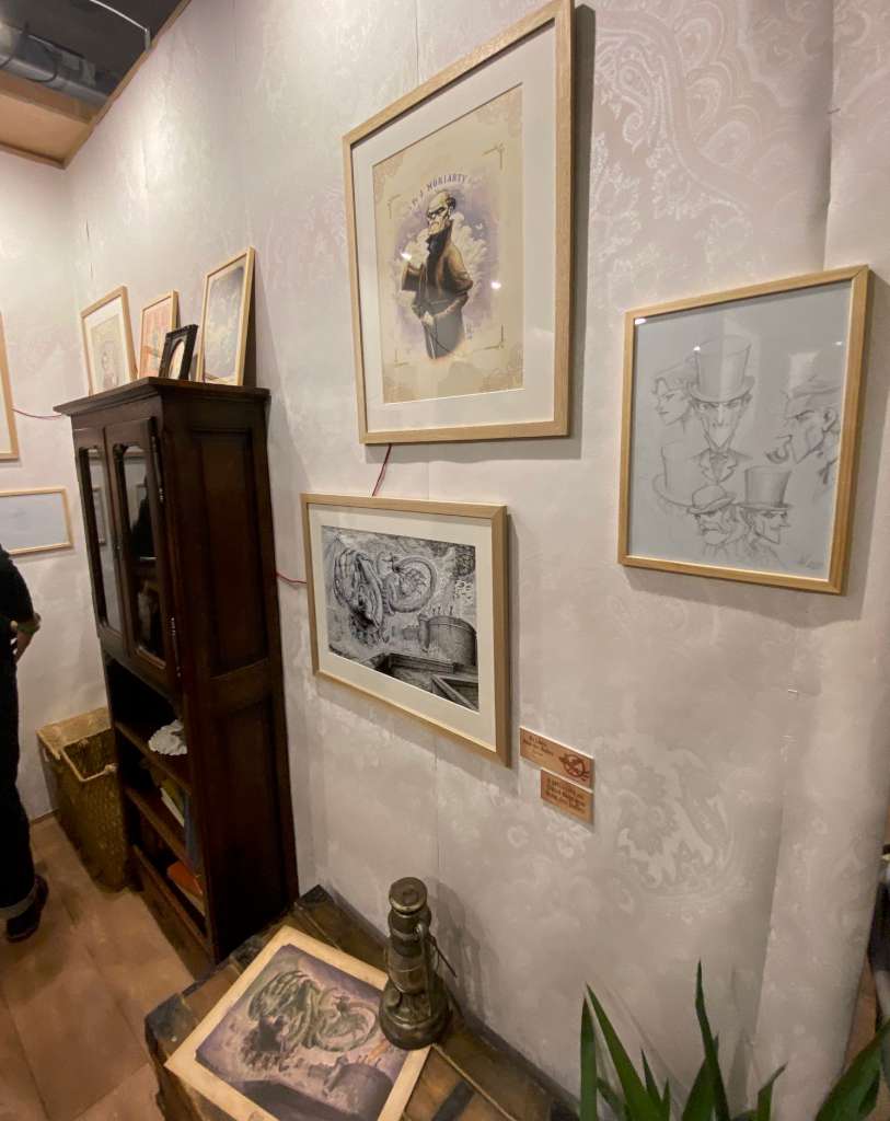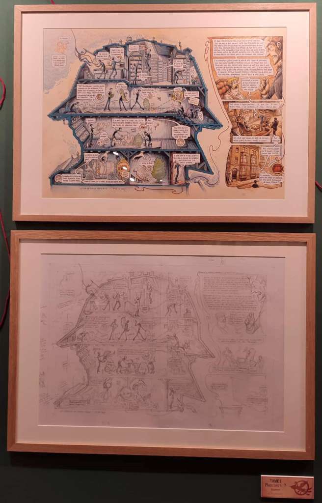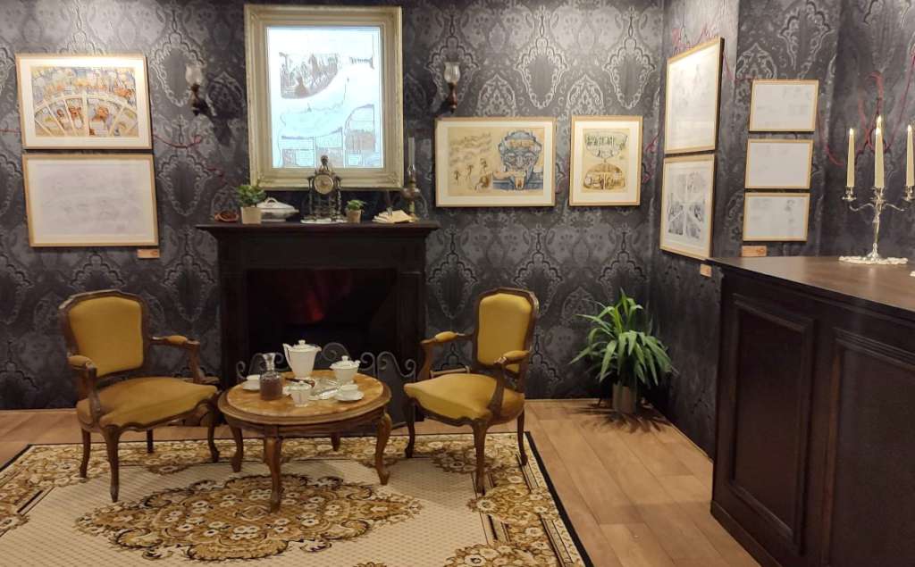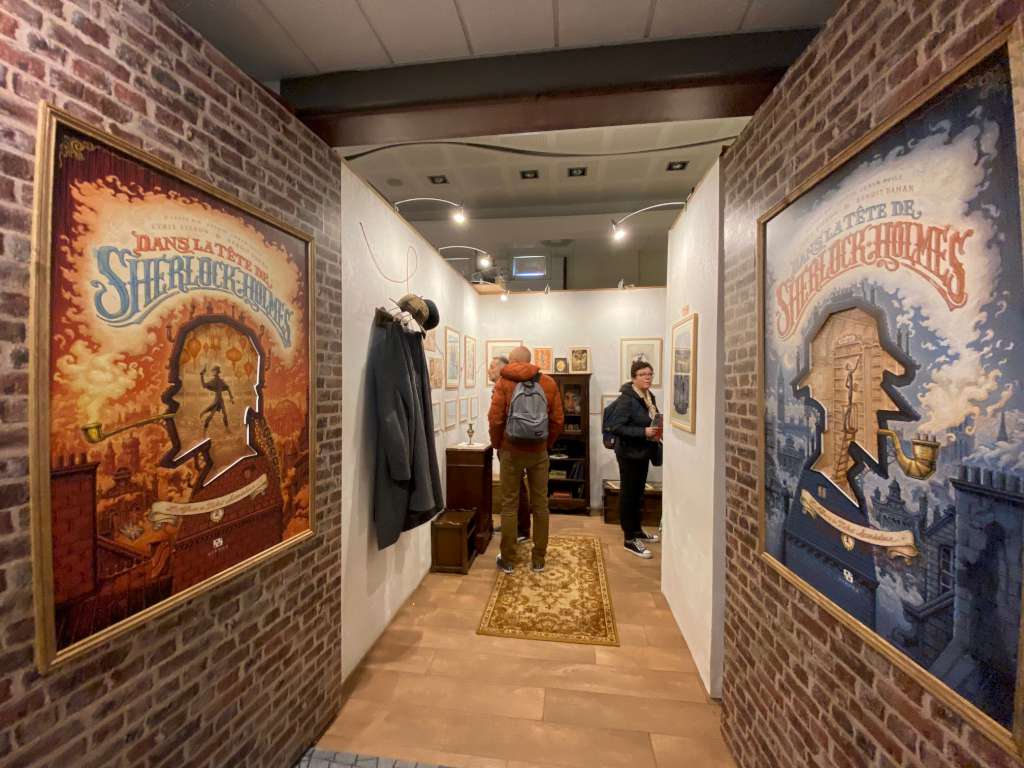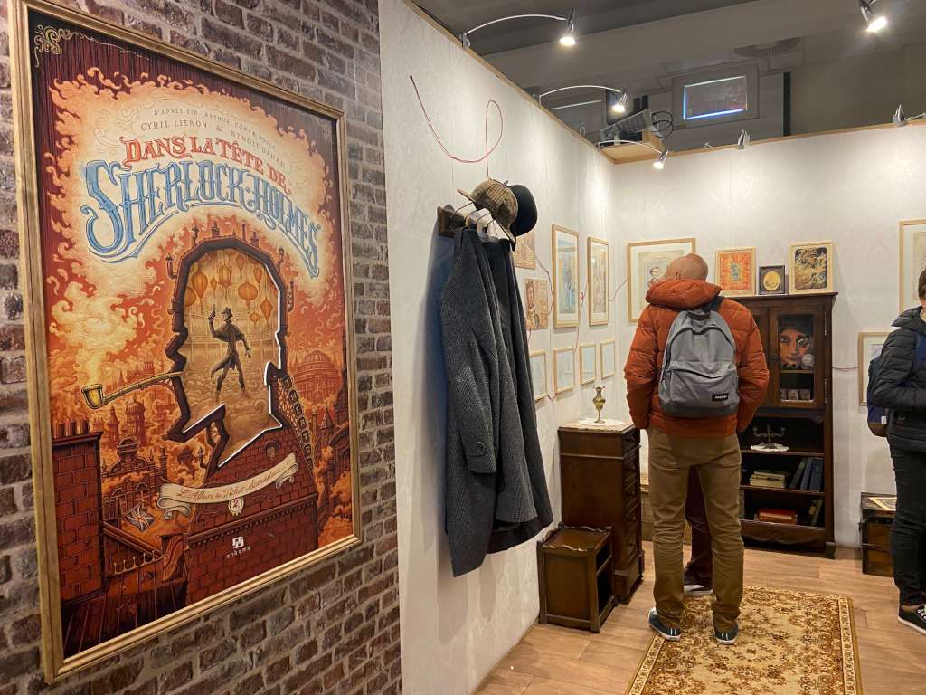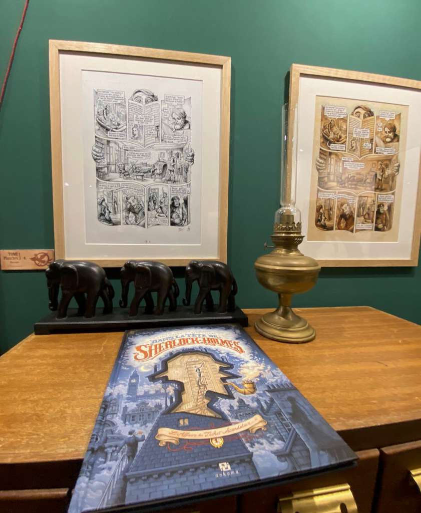 Le résultat était splendide. Nul besoin d’être holmesologue (ou sherlockian en V.O) pour apprécier cette dépaysante visite. En suivant le fil rouge et les papiers peints qui délimitaient les différents espaces, on pouvait admirer les planches en noir et blanc et leur version colorisées couleur sépia. On avait aussi le plaisir de découvrir des extraits de storyboards, des recherches de personnages , des crayonnés, des illustrations inédites pour des ex-libris et même en avant-première les esquisses ayant servi de base au superbe coffret limité qui paraîtra le 28 octobre et regroupe les deux tomes. Le visiteur entrait dans le vestibule du 221 B Baker Street, puis découvrait son bureau, sa bibliothèque, son violon et ses postiches puis ses archives et un cabinet d’apothicaire et enfin un salon so British où trônait une cheminée avec un faux feu (très anglais aussi même si un tantinet anachronique) !