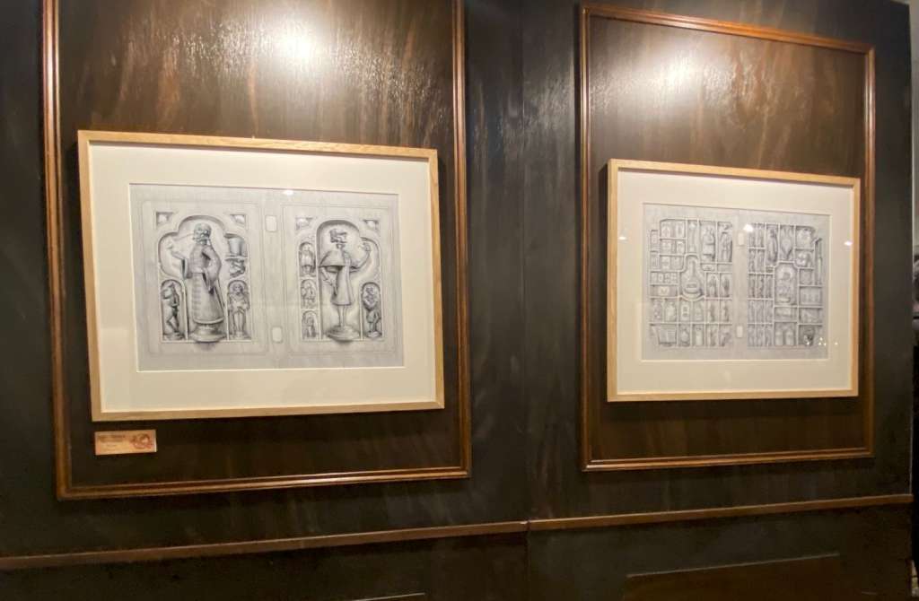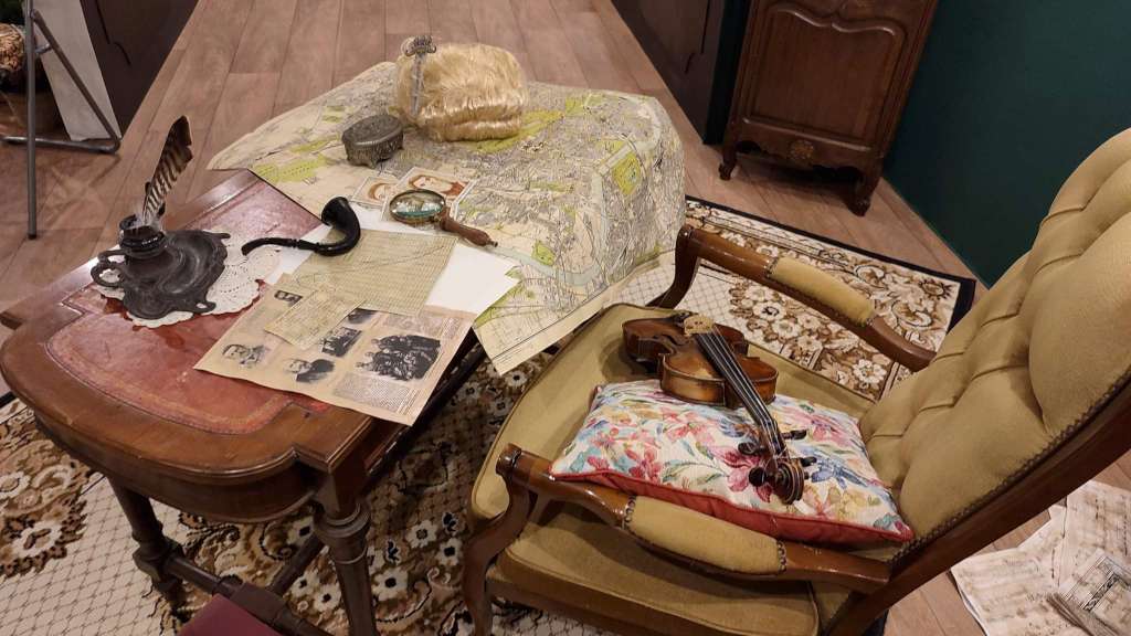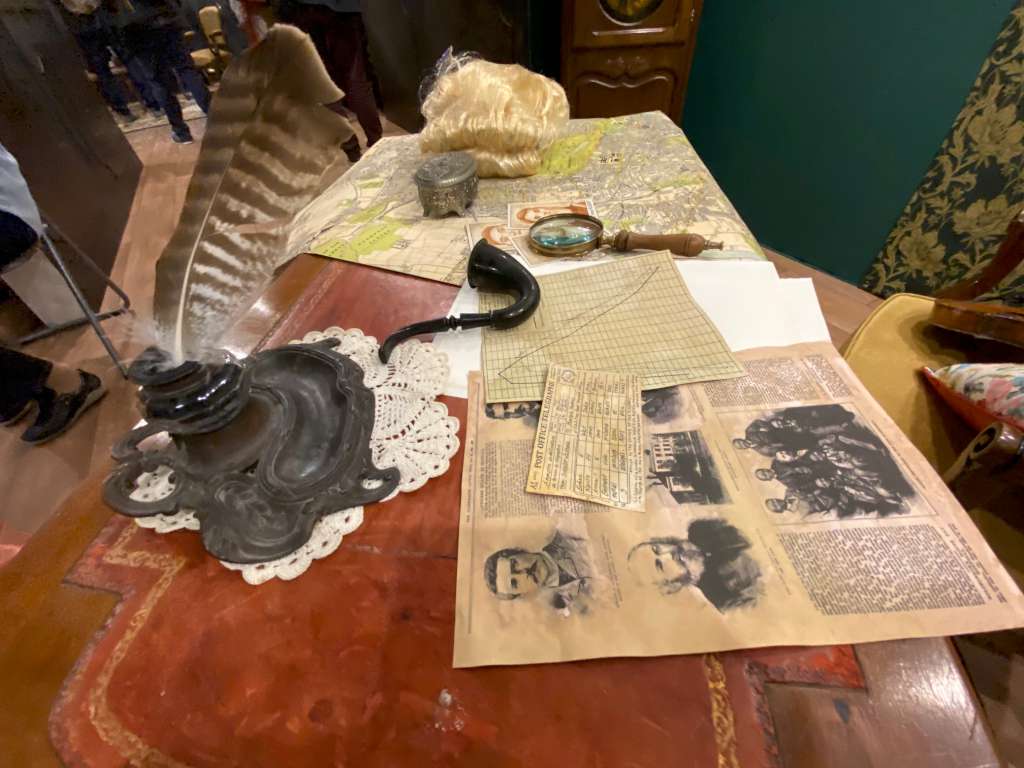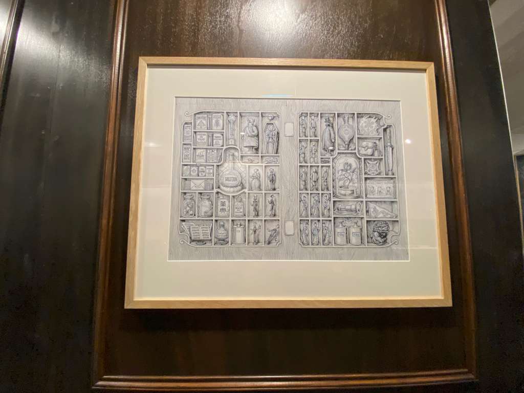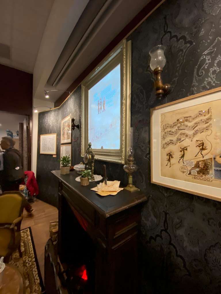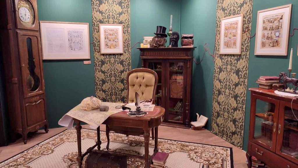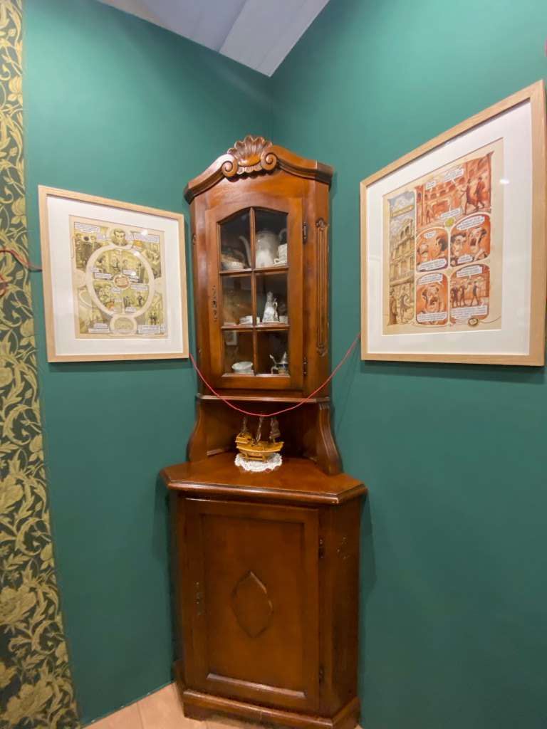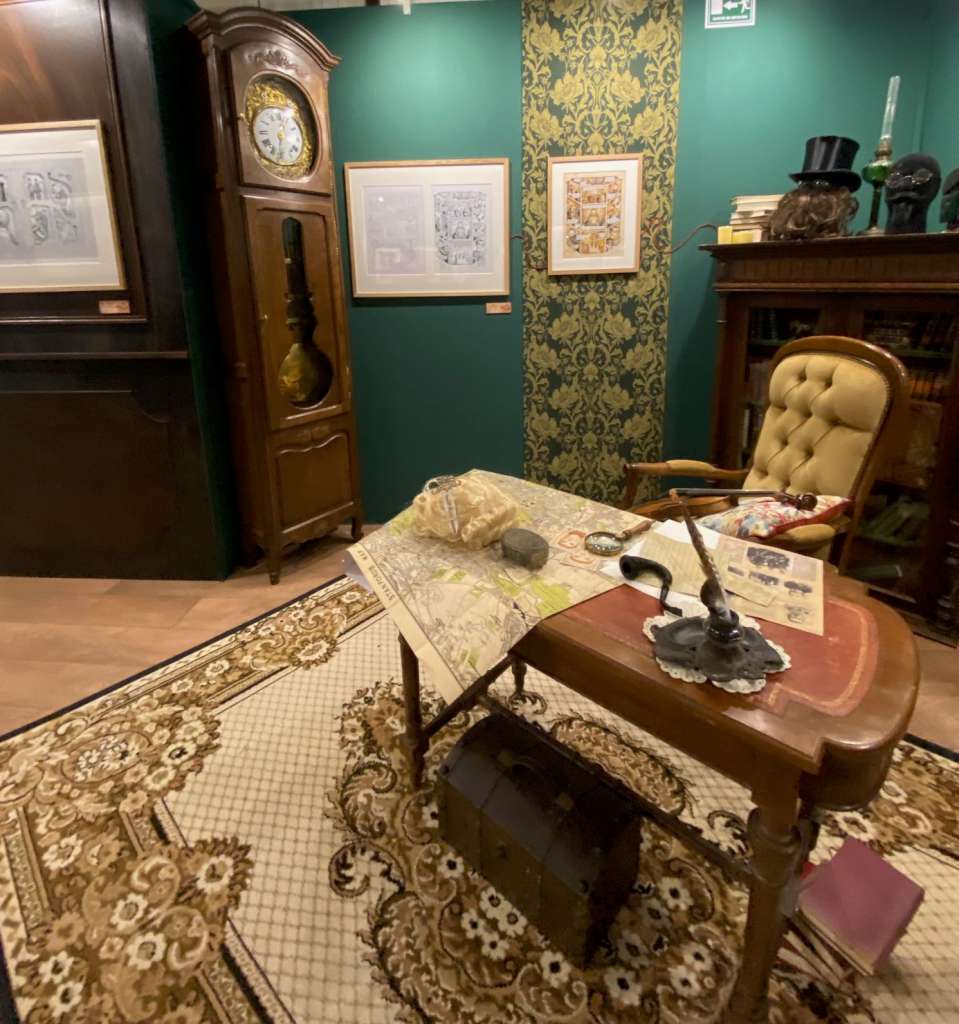 Le résultat était splendide. Nul besoin d’être holmesologue (ou sherlockian en V.O) pour apprécier cette dépaysante visite. En suivant le fil rouge et les papiers peints qui délimitaient les différents espaces, on pouvait admirer les planches en noir et blanc et leur version colorisées couleur sépia. On avait aussi le plaisir de découvrir des extraits de storyboards, des recherches de personnages , des crayonnés, des illustrations inédites pour des ex-libris et même en avant-première les esquisses ayant servi de base au superbe coffret limité qui paraîtra le 28 octobre et regroupe les deux tomes. Le visiteur entrait dans le vestibule du 221 B Baker Street, puis découvrait son bureau, sa bibliothèque, son violon et ses postiches puis ses archives et un cabinet d’apothicaire et enfin un salon so British où trônait une cheminée avec un faux feu (très anglais aussi même si un tantinet anachronique) !