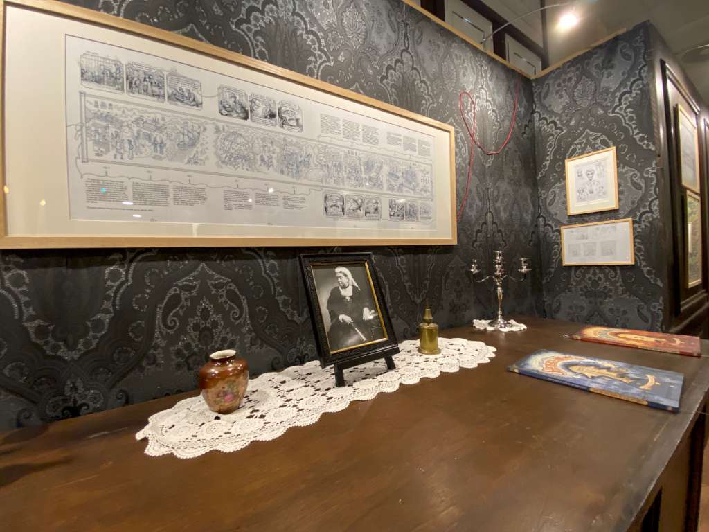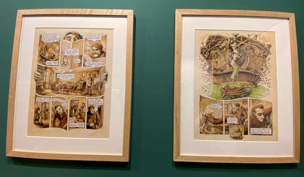 Le public ne s’y est pas trompé ! Les deux albums ont remporté un très grand succès critique et populaire et le deuxième tome avait reçu le prix « coup de cœur du public » à Quai des Bulles l’an passé. Qui dit prix coup de cœur, dit exposition ! Un superbe hommage était donc rendu à cette série au palais du Grand Large du 7 au 9 octobre. Là aussi, le succès fut au rendez-vous : le vendredi, la visite laissa les scolaires ébahis et le samedi ce fut la cohue avec une file d’attente impressionnante. Heureusement, le soleil malouin et le repos dominical jouèrent en notre faveur le dernier jour où nous pûmes déambuler dans les espaces concoctés par les scénographes Régis Thomas et Christopher Lannes. Il leur a fallu cinq mois pour tout rassembler. Ils ont chiné dans les brocantes locales pour recréer une atmosphère cosy et victorienne. A noter également que les reproductions (de nombreux originaux étaient présents mais il y avait aussi des copies d’excellente qualité) avaient été réalisées par des imprimeries de la région.