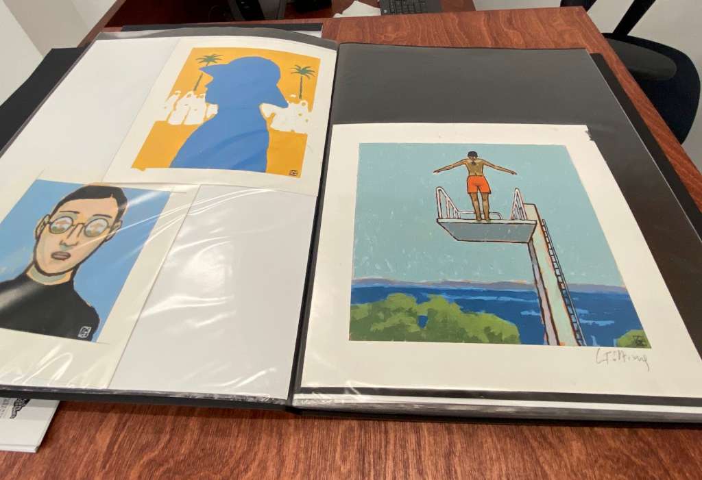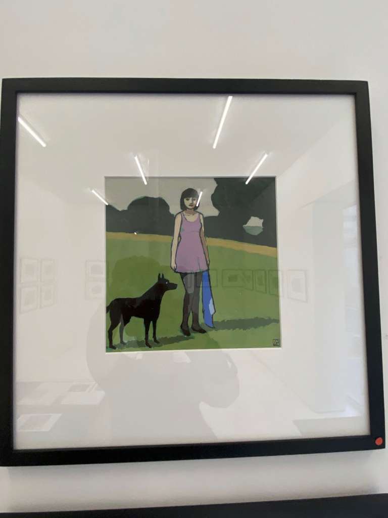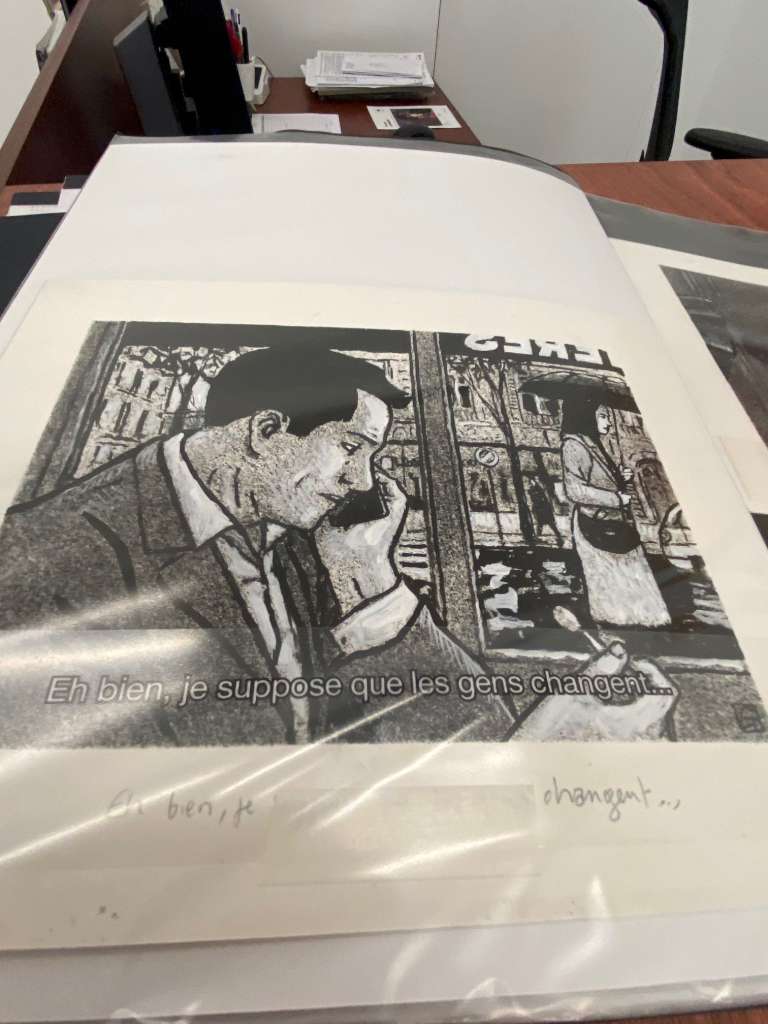 L’exposition rétrospective Gotting de la rue Chapon illustre bien le lien entre les arts puisque non seulement elle nous présente les tableaux en noir et blanc de « Version originale » mais également les illustrations couleurs réalisées par le dessinateur pour la plaquette de présentation de la saison 2023 du théâtre des Célestins à Lyon. Ces dernières illustrations sont plutôt de petite taille, presque des miniatures. On y retrouve le trait condensé et épais et les couleurs flamboyantes auxquelles l’artiste nous a habitué dans ses illustrations de couverture ( dont les fameuses des romans « Harry Potter »). Les tableaux qui ont servi à créer l’ouvrage « Version originale » sont plus grands. Sur ces dessins effectués à la peinture acrylique sur papier, on peut admirer la technique si particulière de Gotting (il se sert des petits rouleaux en mousse que les enfants utilisent pour leurs ateliers créatifs) qui donne une texture grainée à ses œuvres et rappelle le rendu un peu flouté d’une vieille pellicule noir et blanc. Les rustines et les textes au crayon montrent également sur certaines toiles les « repentirs » de l’artiste qui intervertit des sous-titres, réinvente lui-même en les créant ses propres histoires, et nous invite doublement au voyage…