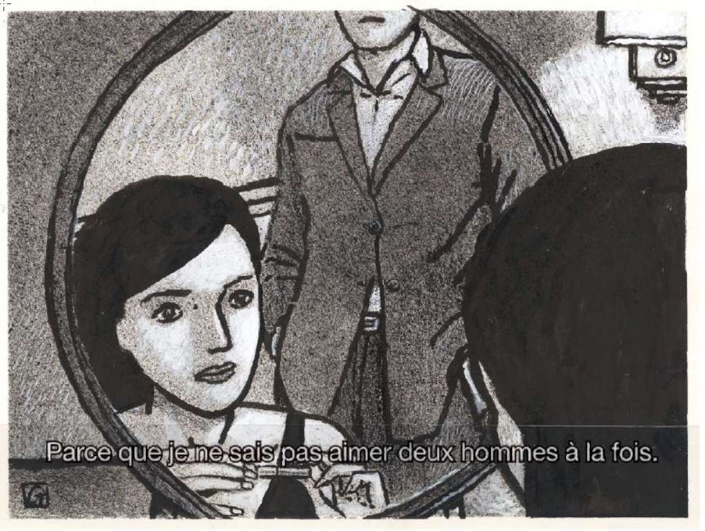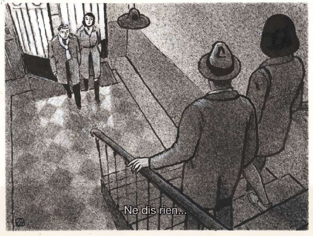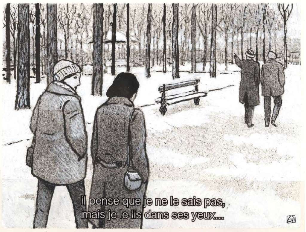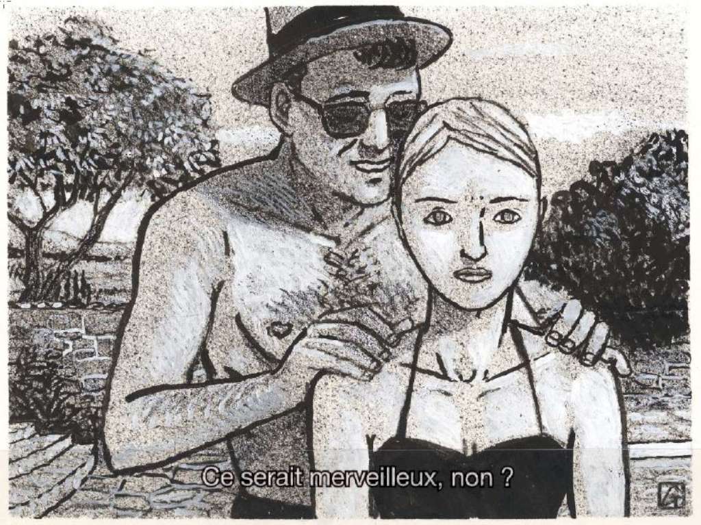 Il n’y a pas de réelle chronologie dans ce livre, pas de fil narratif non plus. Seule indication : les « sous-titres français » placés en superposition sur une bande en rhodoïd conçus par le dessinateur. On a ainsi des extraits de dialogues décontextualisés et on ne peut s’empêcher de lier les images entre elles, de les faire se répondre, de créer des histoires ou plutôt notre propre film ! Ces hommes et ces femmes prodiguent un sentiment de « déjà vu « ( en français dans le texte ! ). On a l’impression de revoir les programmations du « Cinéma de minuit » qui faisaient la part belle aux élégantes telles Ava Gardner, Gene Tierney, Rita Hayworth ou plus tard Audrey Hepburn ou encore Jean Seberg ou Romy Schneider… Mais les bribes de films qui s’égrènent au fur et à mesure que l‘on feuillette le livre sont des films qui n’existent pas, des « films du crayon » nés de l’imagination de l’artiste. Et c’est magnifique et troublant à la fois car le lecteur/spectateur fait sien l’imaginaire de Gotting dans un échange de références partagées . Comme le déclare l’artiste lui-même :