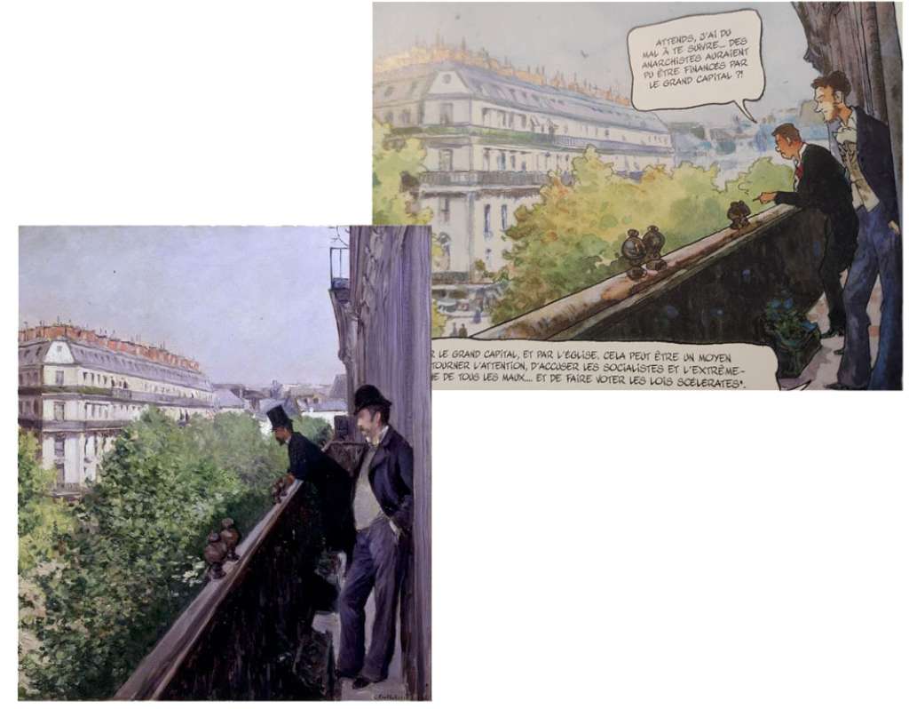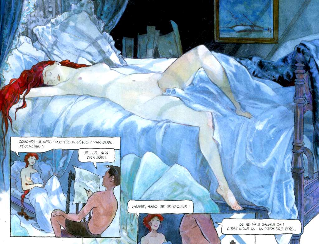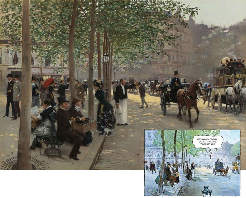 Alexis Chabert a travaillé en couleurs directes à l’aquarelle principalement mais avec des rehauts d’acrylique, de pastel et les silhouettes cernées au stylo à bille ! Et l’ensemble est fascinant. Au détour d’une case et surtout quand il s’en affranchit, alors qu’il nous dépeint les célèbres cabarets du « Lapin agile » ou du « Chat noir » ou les Moulins de Montmartre, il nous évoque tour à tour Toulouse-Lautrec, Pissarro ou Van Gogh ; quand il arpente la haute société on pense à Manet tandis que ses vues des Grands Boulevards nous rappellent les tableaux de Monet, Caillebotte, et de Renoir. Il cite aussi des peintres moins connus tels Gervex ou Edouard Cortes.