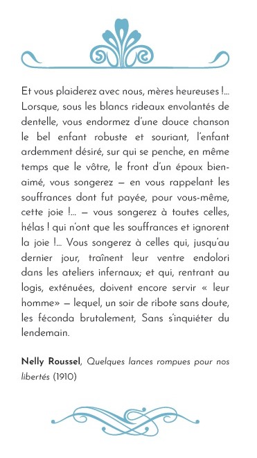 Mais quand dans le premier titre, chaque chapitre était délimité par une citation extraite de l’album lui-même, ici le scénariste choisit de commencer chacun des 4 chapitres qui le constitue par des passages de « Quelques lances rompues pour nos libertés » de Nelly Roussel une pamphlétaire qui lutta contre l’avortement et pour la libération de la femme. Ainsi, l’album se mue en une œuvre engagée qui questionne la place de la femme à l’époque et montre les tentatives de certaines (dont les deux héroïnes) pour échapper au sort qu’on veut leur réserver.