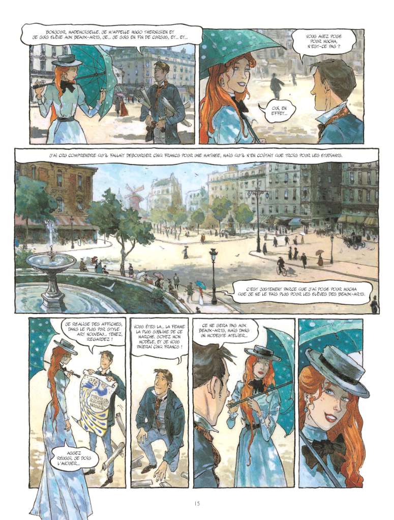 Très vite, l’inspecteur soupçonne la veuve, héritière de l’immense empire. L’enquête révèle alors que l’industriel avait également une maîtresse, Axelle Valencourt, un modèle ayant posé pour de nombreux artistes et notamment Alfons Mucha.