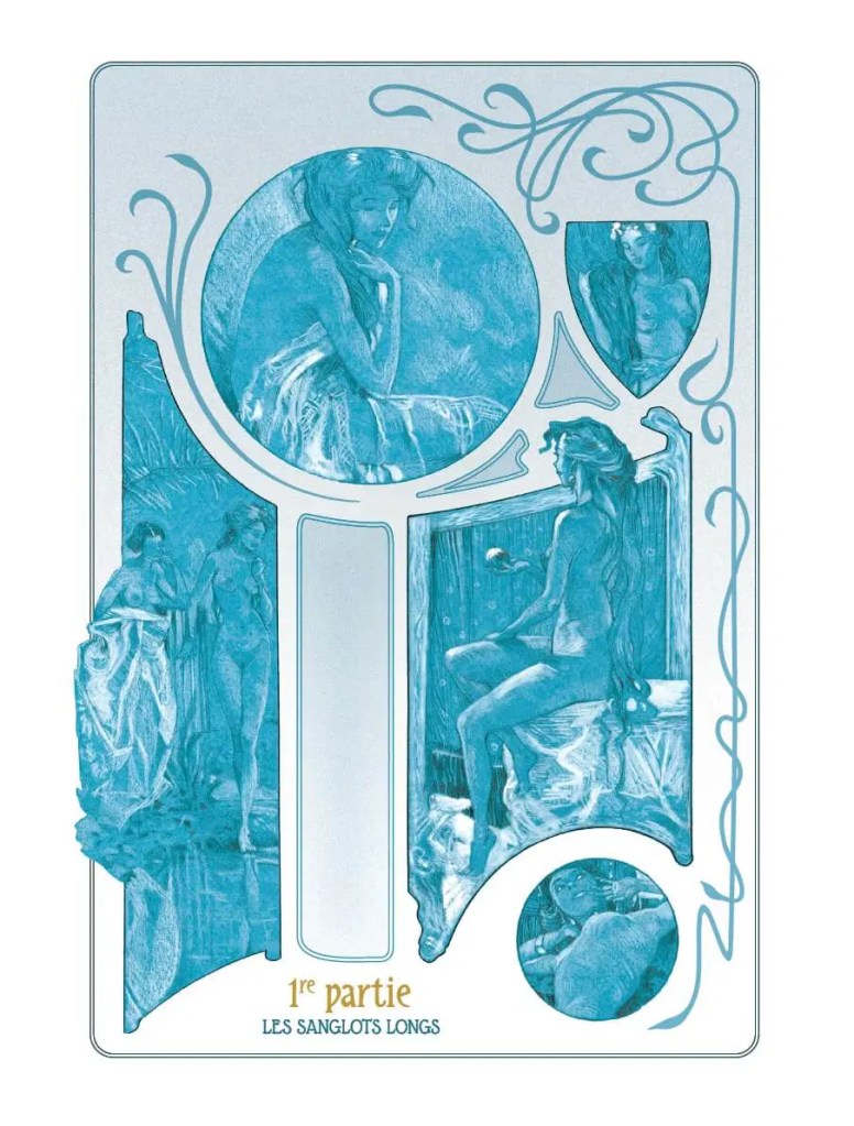 En effet, l’un des atouts principaux de cet album est son graphisme. Dès la couverture, ses couleurs pastel, ses incrustations dorées, ses motifs floraux art nouveau et sa silhouette féminine vaporeuse, on perçoit l’hommage à Mucha que l’on retrouve également dans les têtes de chapitre. Cependant d’autres artistes et courants picturaux sont également convoqués comme l’impressionnisme présent sur la couverture de l’édition de luxe mais aussi dans la marine au bas de l’édition classique…
