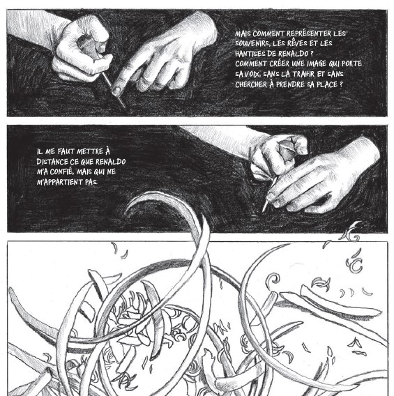 Par ses choix graphiques, l’autrice a voulu rendre compte non seulement de son point de vue à elle mais aussi de celui de Renaldo. Aussi, va-t-elle utiliser deux techniques différentes pour ses représentations.