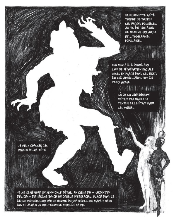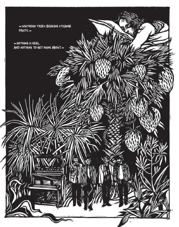 Black and white. Quelques planches faites d’après les photographies de lynchage aux États-Unis sont réalisées en papier brûlé afin d’éviter le voyeurisme sans pour autant édulcorer le sujet. Leur liseré brun orangé est la seule touche de couleur qu’elle s’autorise.
