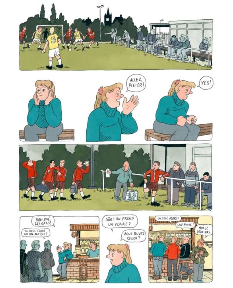 Quelle n’a pas été notre surprise après la lecture de cet album de découvrir que son autrice était toute jeune. Clara Lodewick inaugure justement une nouvelle collection de la maison Dupuis consacrée aux romans graphiques de jeunes auteurs : « Les Ondes Marcinelle ». Et elle le fait avec brio ! Son travail fait preuve d’une grande maturité surtout sur le plan scénaristique. En effet, dans un cadre en apparence bucolique (la campagne et les petits villages) , elle montre comment le poison de la rumeur va se distiller. Il y a du Balzac ou du Flaubert dans cette autrice ! L’album s’ouvre sur une scène de comices agricoles et l’artiste nous dépeint à sa façon ses « Scènes de la vie de province ».
