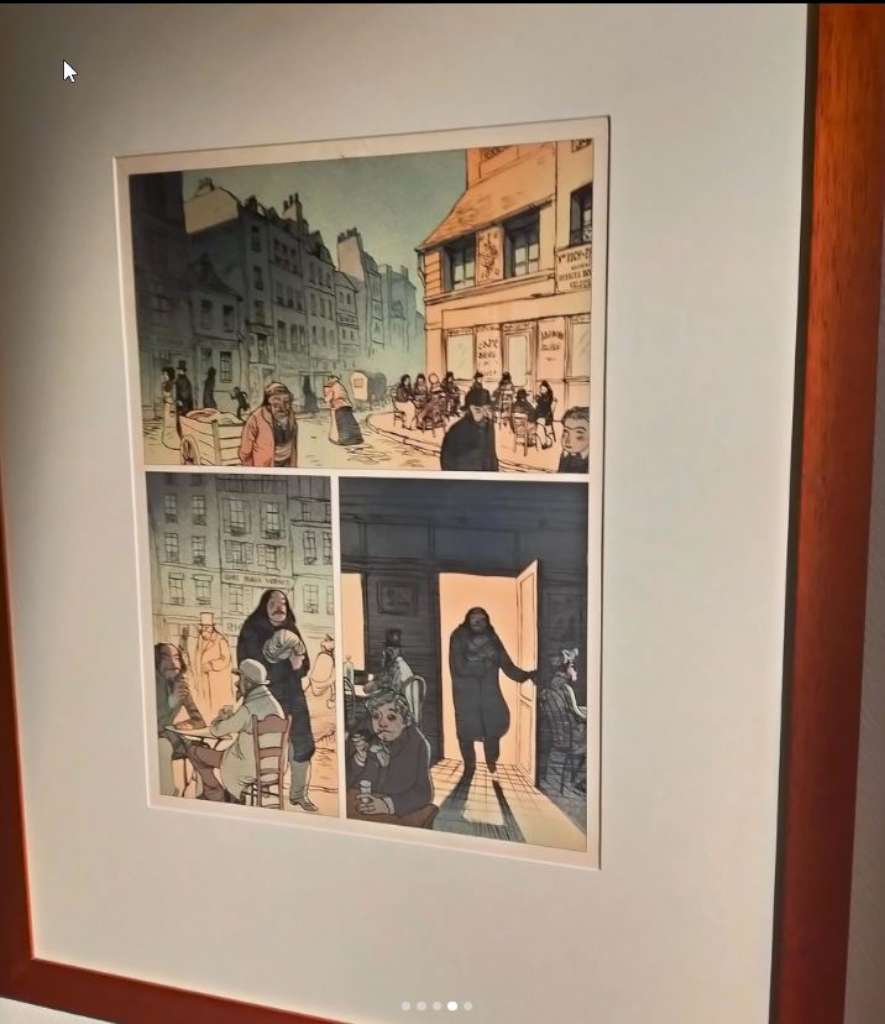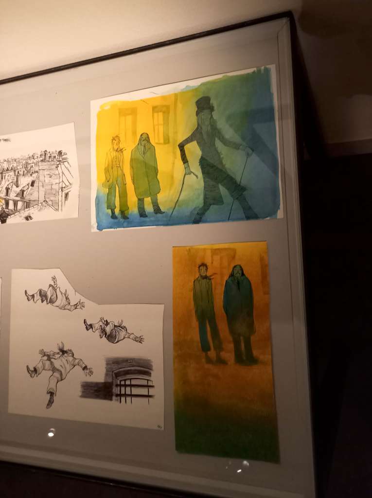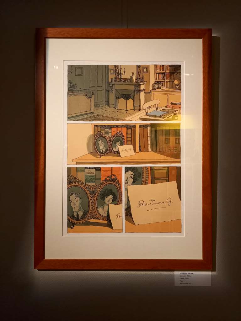 Ensuite ? Edith a elle-même proposé une sélection d’originaux à Bruno Genini le directeur du festival et explique que « comme c’est un prix pour la carrière, [elle] voulait mettre un peu des albums les plus représentatifs ». On y découvre ainsi des planches de la pentalogie « Basil et Victoria », mais également du « Trio Bonaventure » bien sûr ainsi que du diptyque « Eugène de Tourcoing Startrec » et quelques planches des « Hauts de Hurlevent » et des one shots « Le jardin de minuit » et « Emma G Wilford » Des objets du passé (une valise, un vieux gramophone) viennent compléter cette visite dans le temps car la majorité des œuvres se déroule à la fin du XIXe. Son dernier-né « Séraphine » est également présent mais sous forme de reproductions grand format de quelques planches puisque pour la première fois, Edith a travaillé pour cet opus entièrement en numérique.