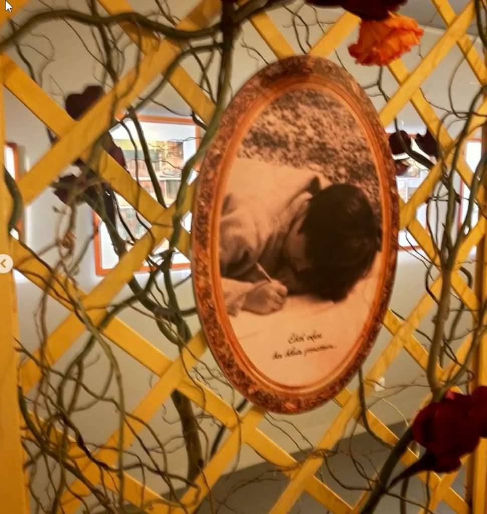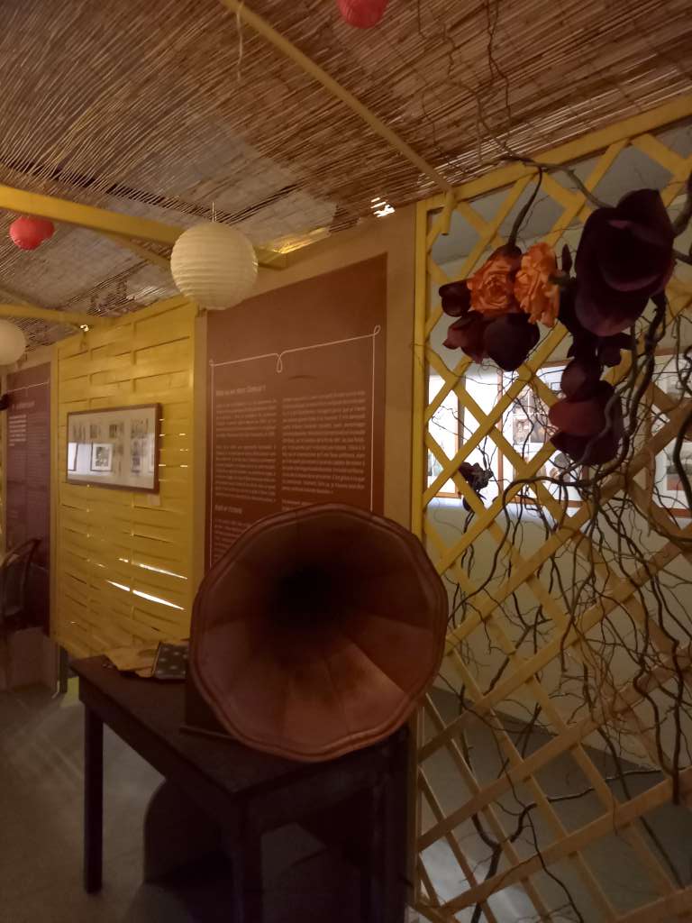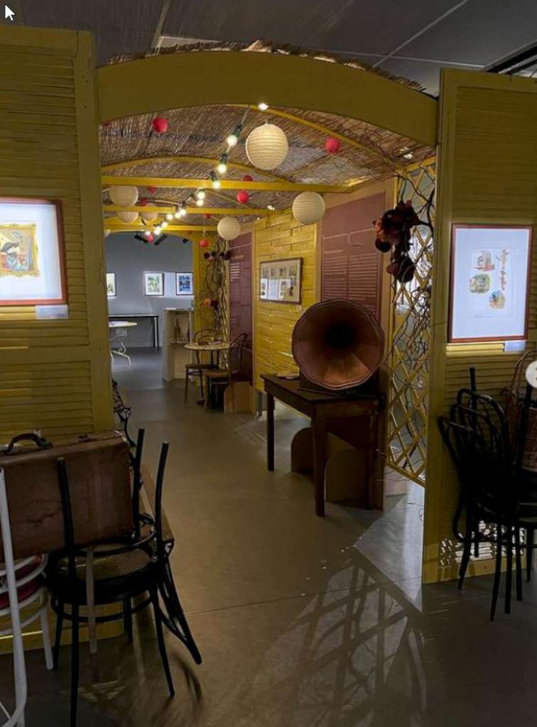 Elle a sciemment choisi de multiplier supports et formats car elle déteste les expos uniformes qui « produisent une répétition un peu stroboscopique » et puis cette absence de monotonie lui ressemble bien, elle qui se dit « bordélique ». Elle décrète qu’elle ne peut pas faire une expo trop linéaire et que « s’il y a un petit côté foutraque cela [lui] correspond mieux ! » N’allez pas cependant imaginer un véritable capharnaüm ! Non, l’exposition est superbe avec ses couleurs pimpantes et ses cloisons en treillis de jardin peints en jaune d’or et plantés de fleurs qui donnent un côté transparent et aérien à l’ensemble comme les luminaires en papier de riz et met bien en valeur les différentes facettes et talents du Grand Boum 2021.