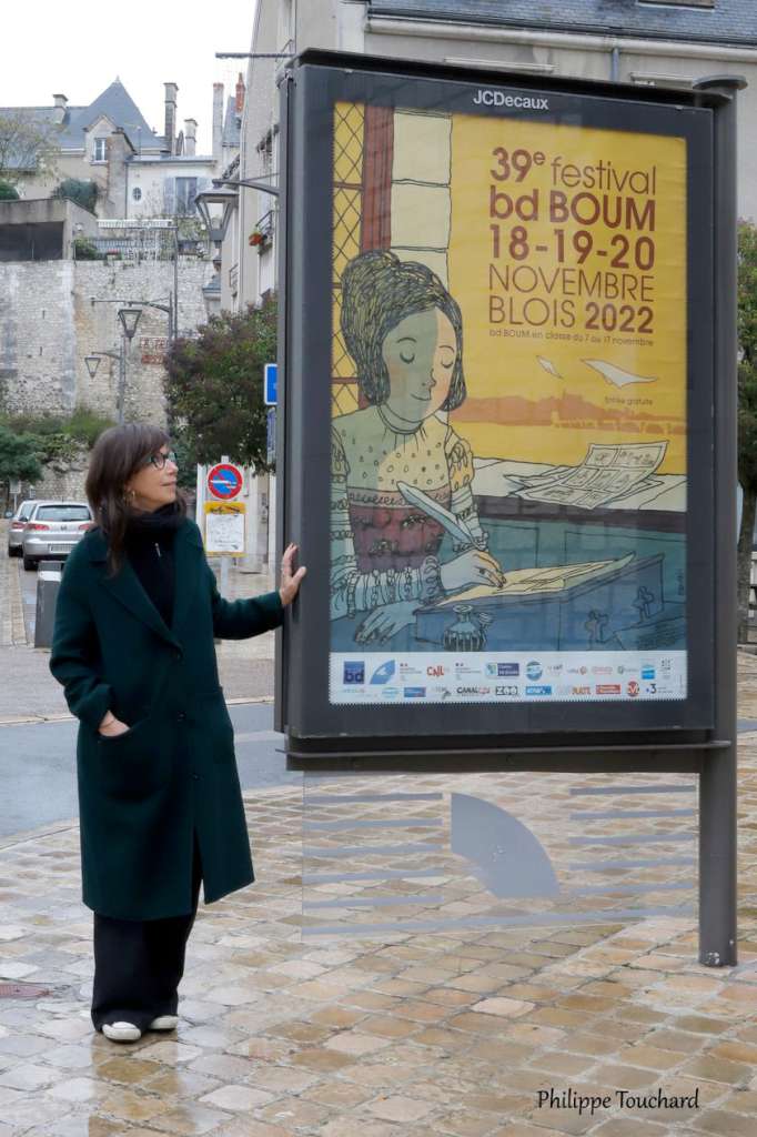 Sur cette affiche, on remarque à travers la fenêtre du château de Blois le passé historique de la ville via quelques éléments d’architecture (les toits et le pont) mais surtout une jeune femme du XIVe siècle comme le montre sa coiffure et le tissu de sa robe ornée de salamandres – l’emblème de François 1er _ occupée à dessiner à la plume. A la manière du « Feuilles volantes » d’Alexandre Clerisse, Edith met en scène avant l’heure (mais ne l’avait-telle déjà pas fait avec son complice Corcal dans « La chambre de Lautréamont » ?) une autrice de bande dessinée car on aperçoit des feuilles avec des planches et des cases et elle écrit aussi un texte en vieux français donc il s’agit également d’une scénariste.