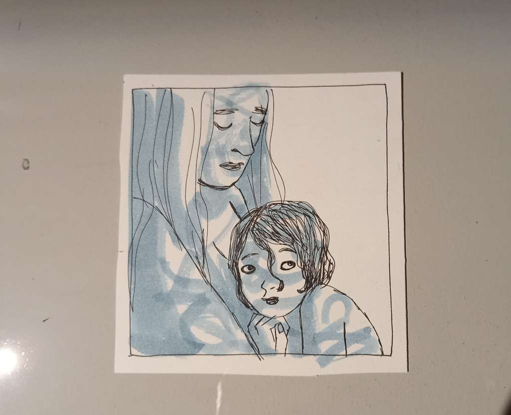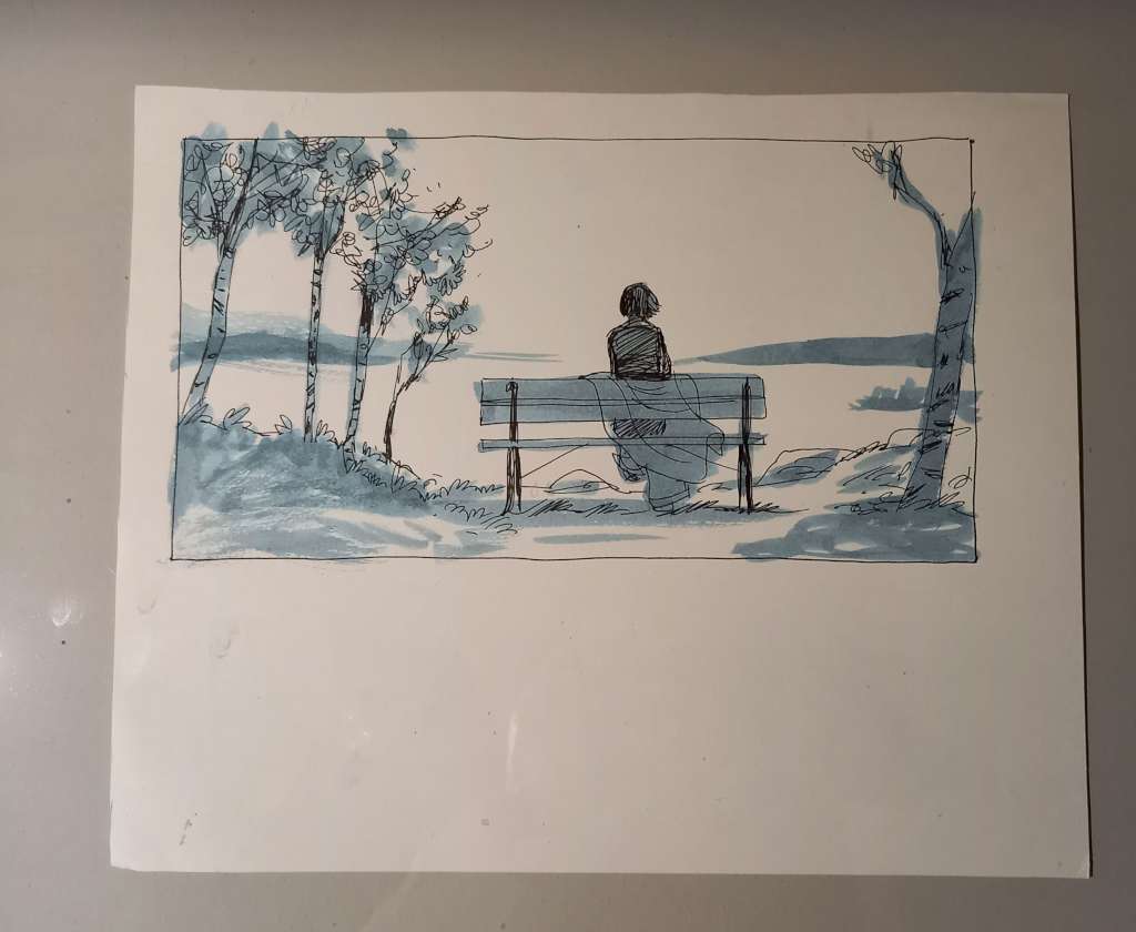 Comme ce que préfère Edith lorsqu’elle se rend dans des expos c’est découvrir le processus créatif, elle a aussi décidé de « faire un pêle-mêle avec des recherches et des cases pour montrer la façon dont [elle] procède » et choisit ainsi de réaliser des vitrines avec des crayonnés, des essais de lavis et même de petits carnets de recherches.