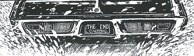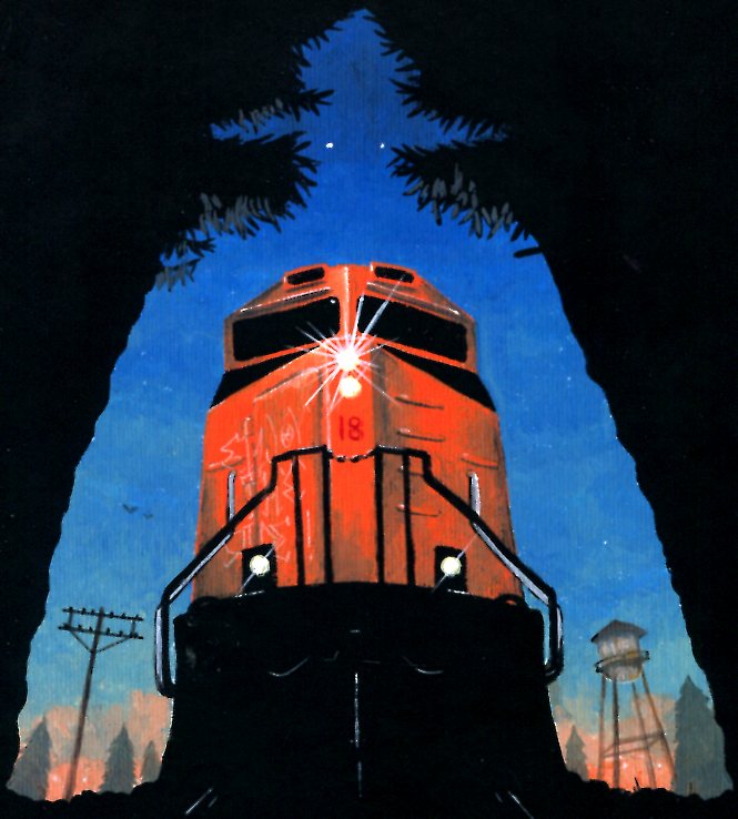 En 4ème, un train orange fonce vers nous alors qu’en arrière-plan, dessinée par le paysage, se dresse la silhouette du tueur …