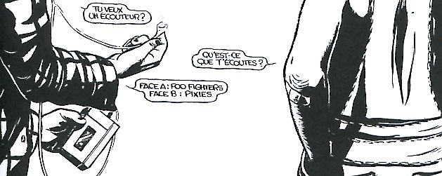 Le récit est découpé en 20 courts chapitres (plus un portant le symbole de l’infini, je n’en dirai pas plus …) dont les titres ne sont autres que ceux de morceaux des années 90, du grunge bien sûr mais pas que. En page titre de chapitre, on trouve une cassette. Quant à la numérotation, elle est matérialisée par des clous, ces clous de chemins de fer que d’aucuns en Amérique se plaisent à collectionner. En fin d’album, on retrouve la playlist sous forme de QR code.