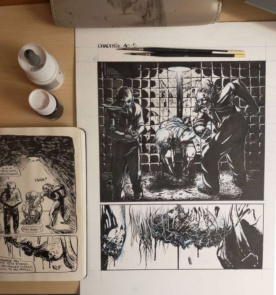 J’essaie de travailler dans l’image, arriver à faire quelque chose de poisseux parce que l’horreur c’est un genre, c’est aussi un challenge qu’on veut se donner. faire peur à ton lecteur mais la peur elle passe par le découpage, faire monter ne tension le lecteur mais aussi le dégoûter, le hanter. Déjà, si je peux avoir quelques lecteurs qui ont ce mouvement de recul face aux planches, je suis content.
