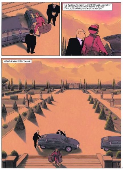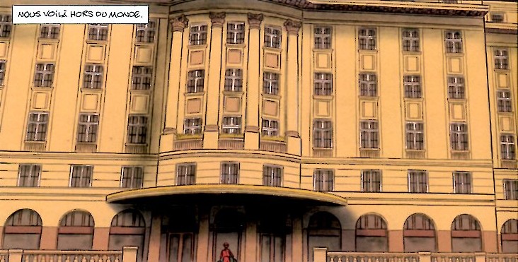 Ce n’est plus au Moustic Hôtel mais au Pacific Palace que Spirou officie. Il n’est pas le seul à avoir coiffé le calot puisqu’il a réussi à faire embaucher Fantasio, alors sans emploi, en tant que groom. Cet établissement prestigieux niché entre lac et montagne a été réquisitionné, vidé de tous ses clients et, outre nos deux lascars, le staff « trié sur le volet », réduit au minimum : Le directeur M. Paul, Julia la femme de chambre et le cuisinier M. Reynold. Le parc cependant accueille un important dispositif de sécurité constitué de gendarmes et de tireurs d’élite. Il faut dire qu’on attend la venue d’Iliex Korda alias « Le boucher », dictateur déchu d’un petit pays des Balkans, le Karajan, venu trouver refuge en France et devant rencontrer secrètement un personnage important. Rien ne doit fuiter ! Une bonne raison de tout boucler afin d’éviter toute incursion des journalistes. Seccotine en est réduite à faire le pied de grue devant les grilles fermées. Le tyran arrive, accompagné de ses imposants gardes du corps, sa femme et … de la fascinante Elena, leur fille. Spirou, subjugué, va plonger dans les yeux verts de la belle, s’y noyer, bref, en tomber immédiatement amoureux… Coups de vent à l’extérieur, coup de foudre à l’intérieur! Coupés de tout, ce petit monde va vivre des journées en apparence banales baignant dans une ambiance feutrée quoiqu’un peu mystérieuse jusqu’au troisième soir – Ah! la sublime scène de la piscine, élément central de l’album – à partir duquel tout va basculer et les évènements se bousculer …