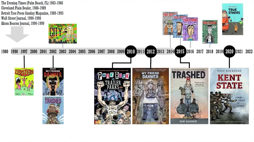 Natif de la petite de ville de Richfield où il a passé une partie de son enfance, vivant actuellement à Cleveland, Derf Backderf a peu quitté son Ohio natal. Aussi, le côté autobiographique est-il très présent dans son œuvre et l’action de ses albums se déroule-t-elle dans un rayon de 100 km autour de Cleveland. Il a abandonné ses études artistiques et endossé pendant un an l’habit d’éboueur avant de reprendre des études de journalisme et embrasser ce métier qu’il quittera pour se consacrer entièrement à la bande dessinée. Maniant l’humour ou la gravité selon le sujet abordé, le dessinateur porte un regard journalistique acéré sur les dérèglements et dérives de la société américaine.