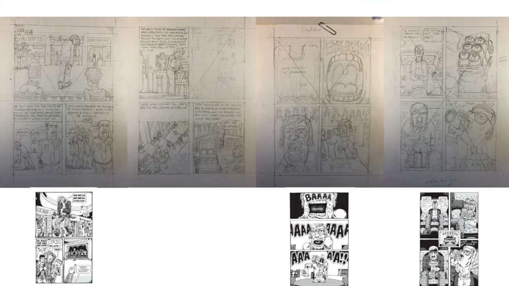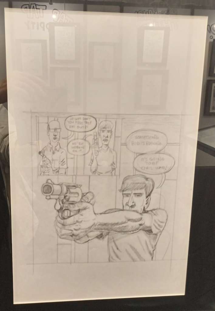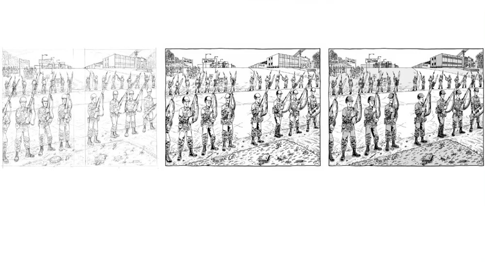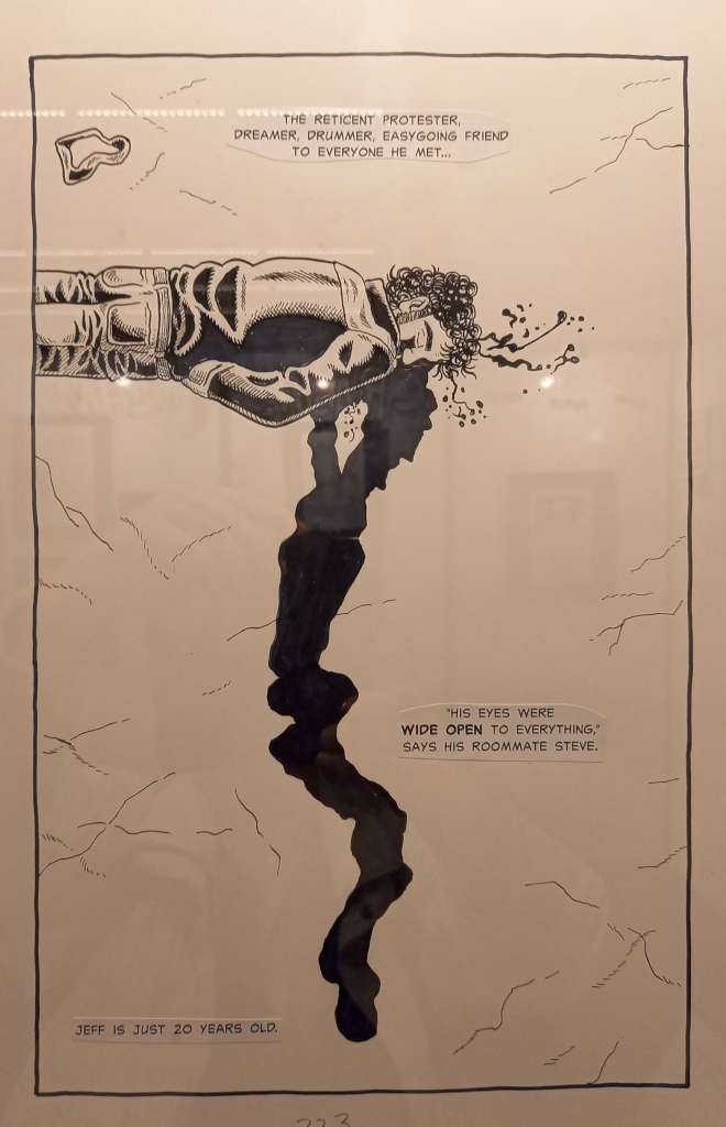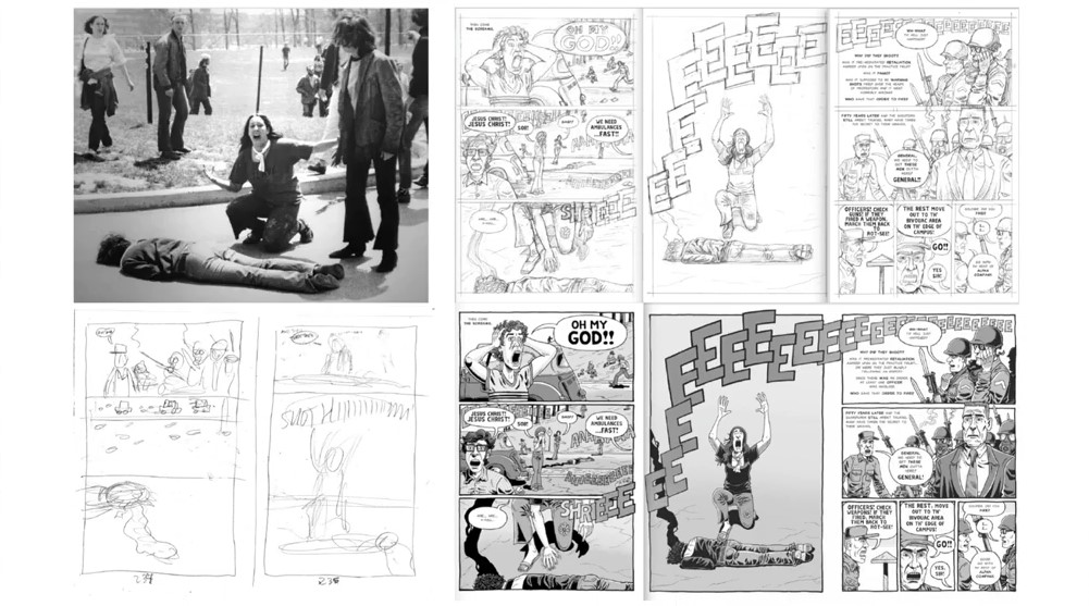Cette photo de John Paul Filo est très connue. Elle a gagné un prix Pulitzer en 1971. Le défi a été de pouvoir la redessiner sans la copier. C’est dans les crayonnés en haut à droite que la composition de l’image se met en place. Le dessinateur a décidé de se focaliser sur le cri plutôt que sur l’image. Les témoins de l’époque ont rapporté qu’à la fin de la fusillade, un silence de mort s’est établi avant qu’un cri ne s’élève. C’est ce cri qu’il a voulu retranscrire visuellement.