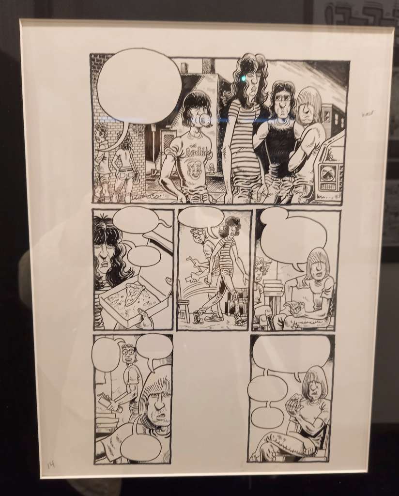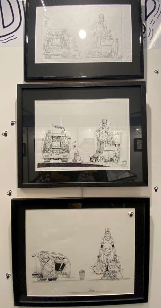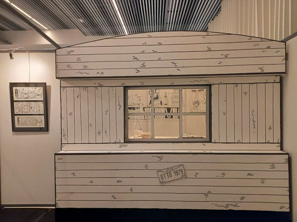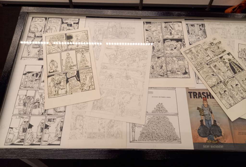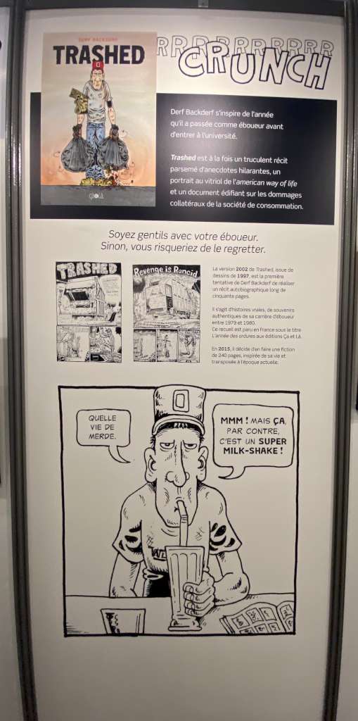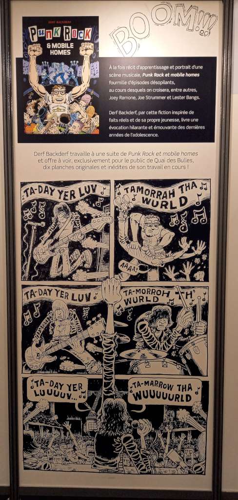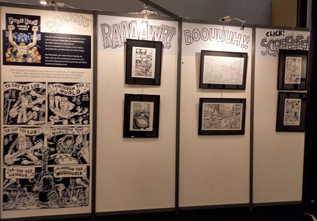 Pour chaque album, un panneau d’introduction et outre les planches, des croquis, extraits de carnets, agrandissements de certaines planches ou cases, le must étant la représentation de la chambre du baron dans un mobile home reconstitué dans laquelle livres, posters et disques rappellent les références du dessinateur. Enfin, en avant première dix planches originales de son travail en cours : la suite de Punk Rock & Mobil Homes.