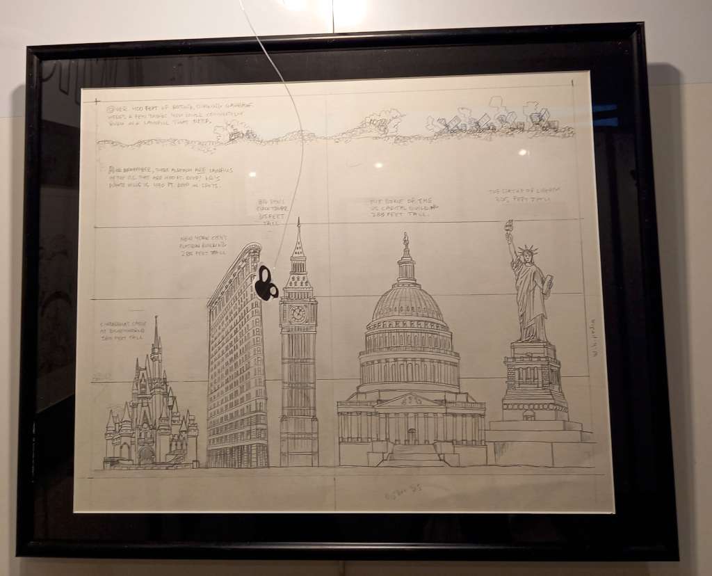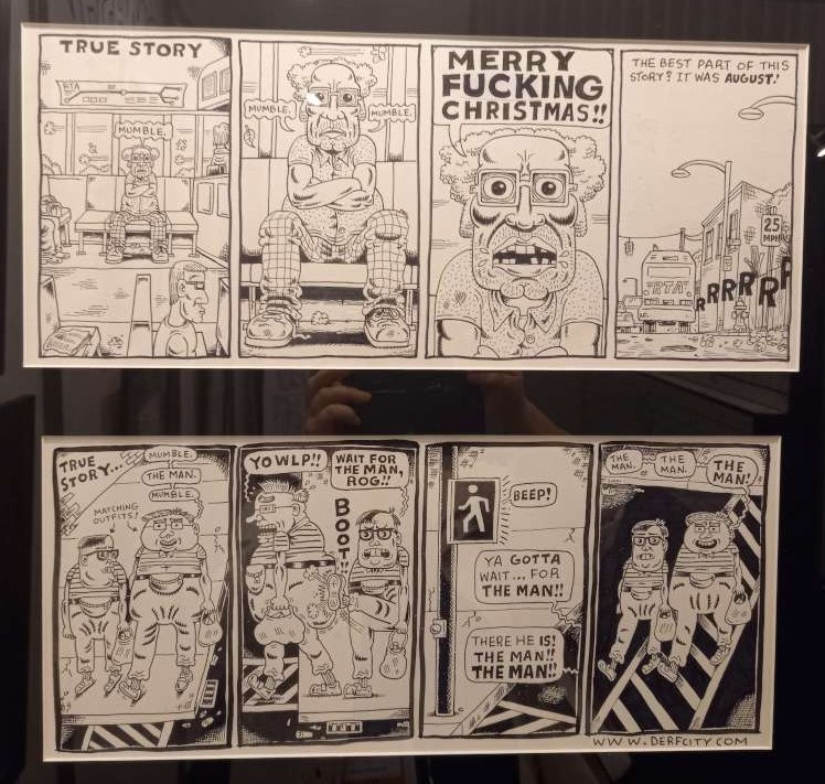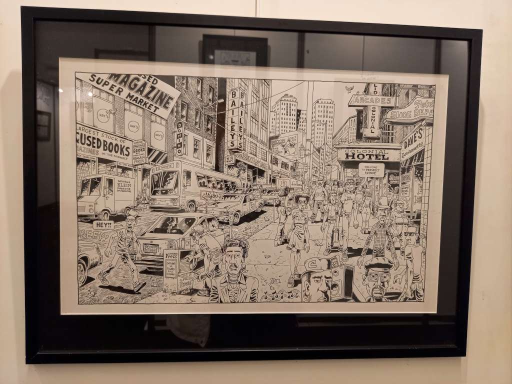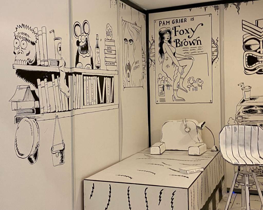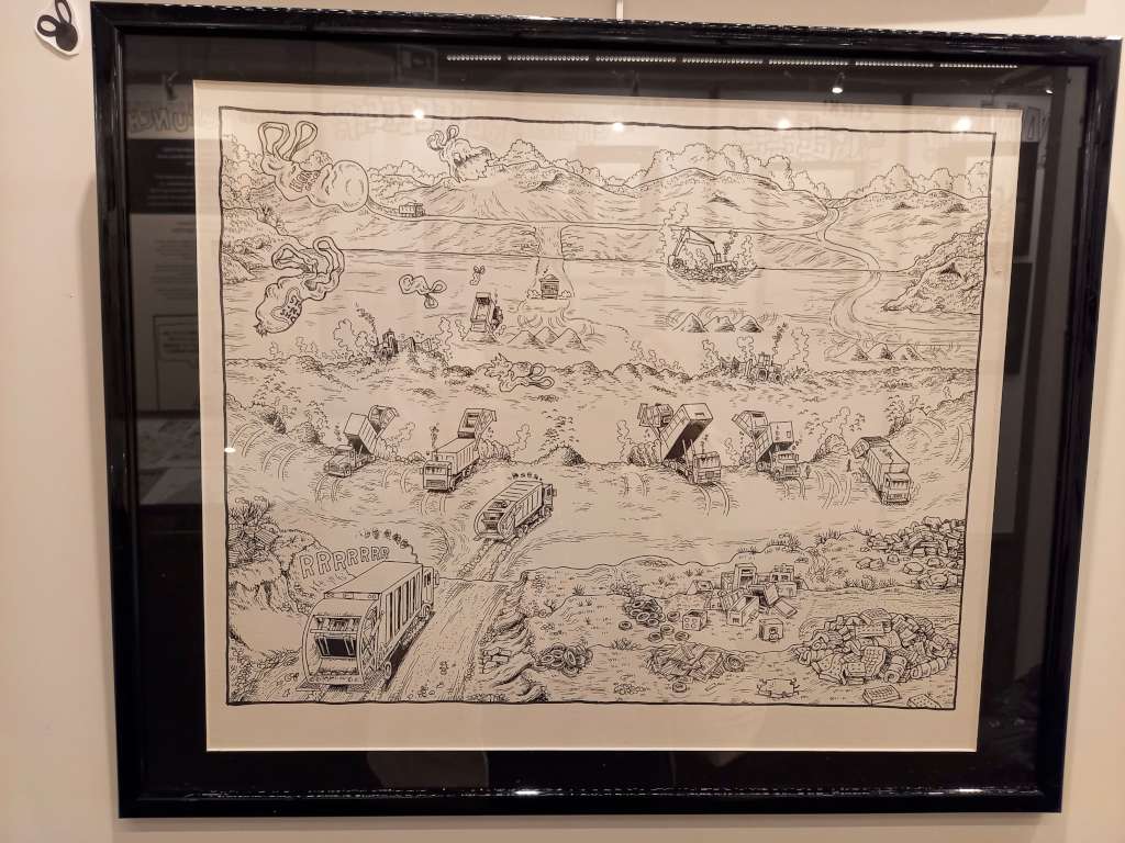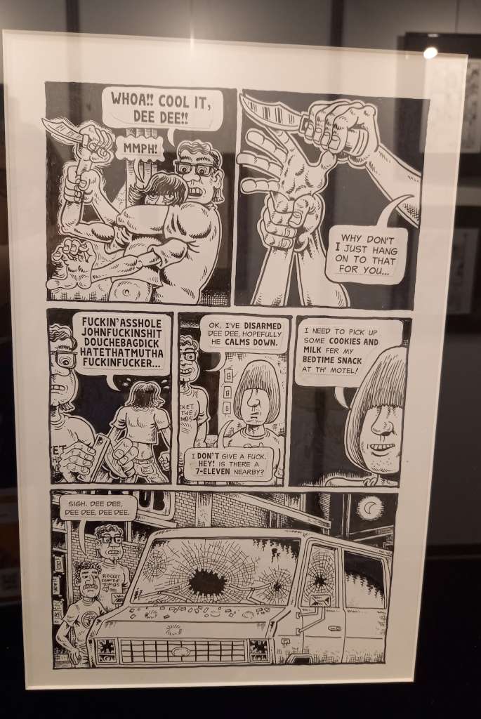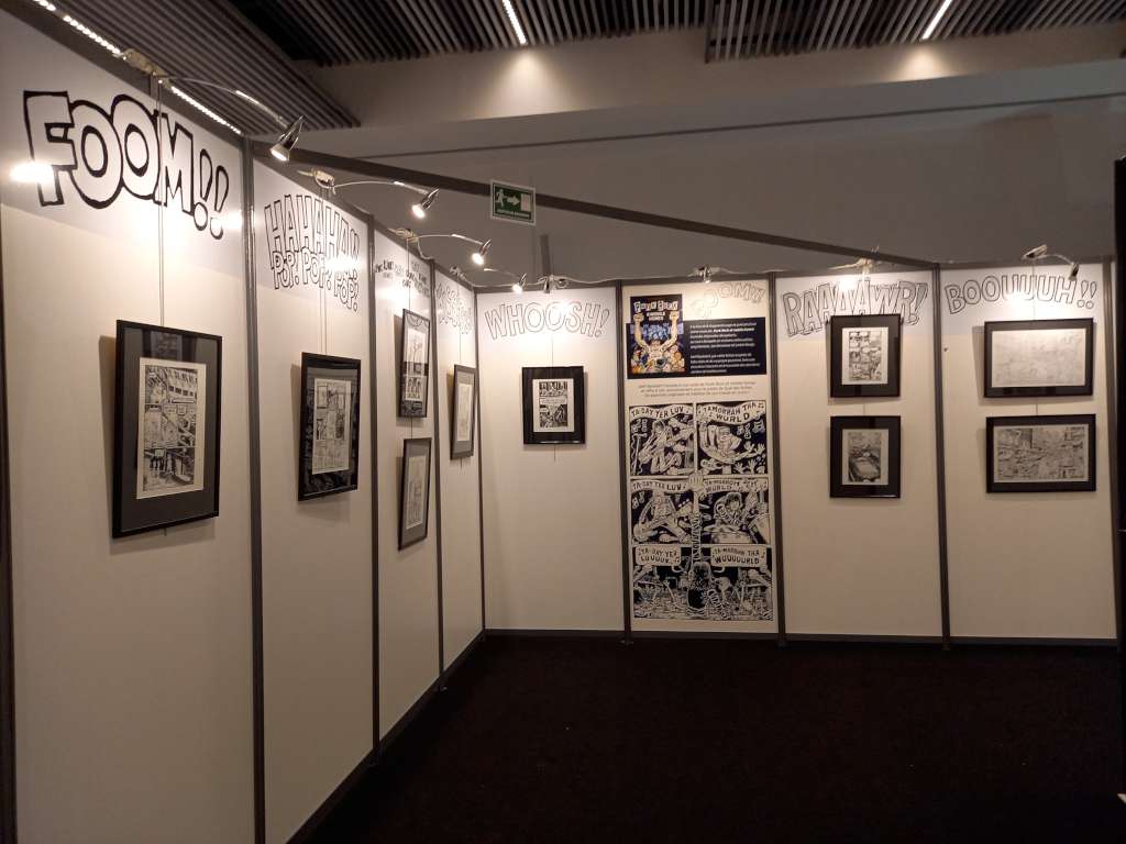 Pour chaque album, un panneau d’introduction et outre les planches, des croquis, extraits de carnets, agrandissements de certaines planches ou cases, le must étant la représentation de la chambre du baron dans un mobile home reconstitué dans laquelle livres, posters et disques rappellent les références du dessinateur. Enfin, en avant première dix planches originales de son travail en cours : la suite de Punk Rock & Mobil Homes.
