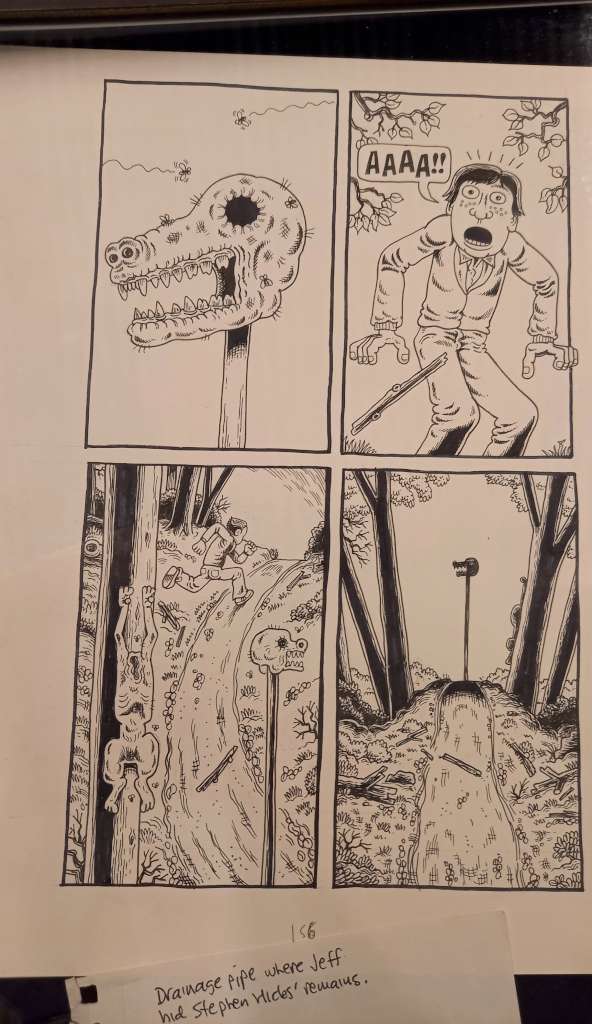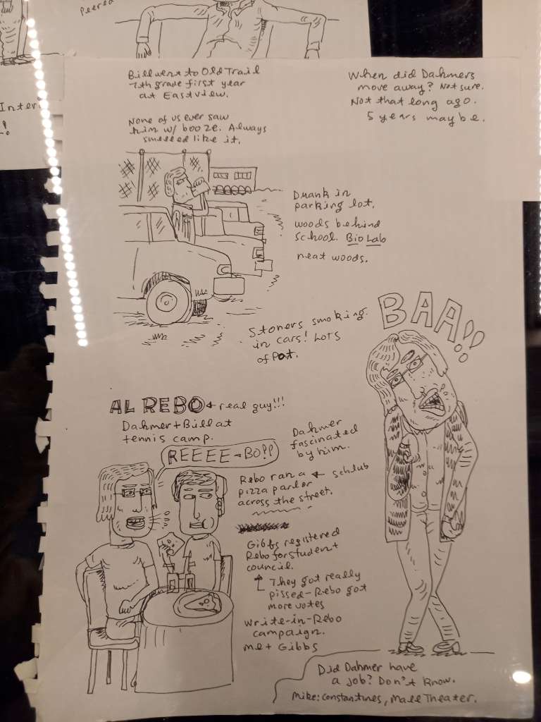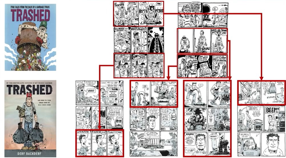 Pas vraiment satisfait de la scénarisation de ses deux premiers albums, le perfectionnisme de Derf Backederf l’a conduit à en faire plusieurs versions : 2 pour Trashed,album pointant du doigt les dommages causés par la société de consommation, pas moins de 4 pour Mon ami Dahmer, relatant la jeunesse de ce camarade d’école solitaire et étrange qu’il a côtoyé sur les bancs de l’école avant qu’il ne devienne l’effroyable tueur en série que l’on sait.