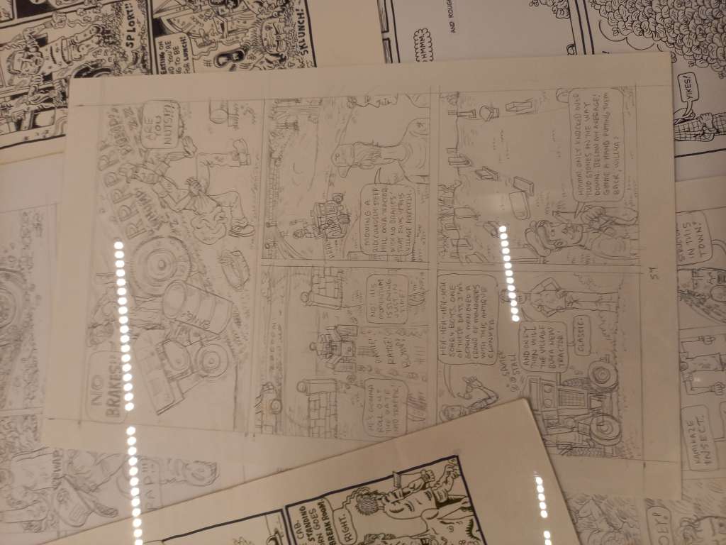 un dessin très rapide de mise en place, puis le crayonné (c’est l’étape sur laquelle il passe le plus de temps), l’encrage et enfin la version définitive