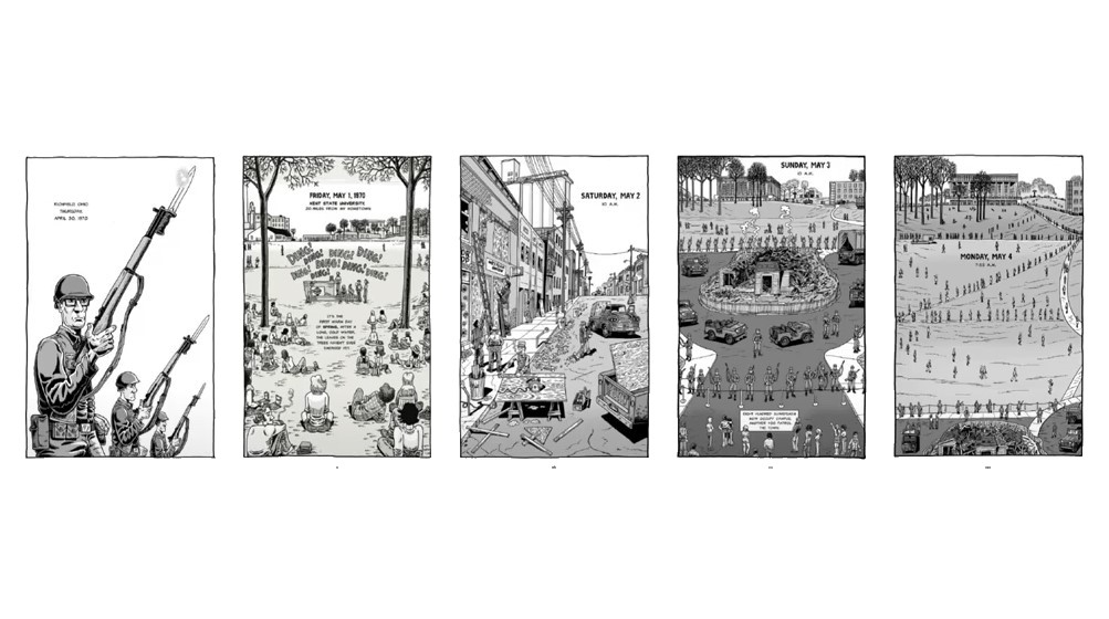 Derf Backderf décrit très minutieusement le drame et les trois jours qui l’ont précédé en s’attachant également à la fidélité de la représentation des lieux. Il va pour cela mener de nombreuses recherches et s’appuyer sur une documentation très fournie.