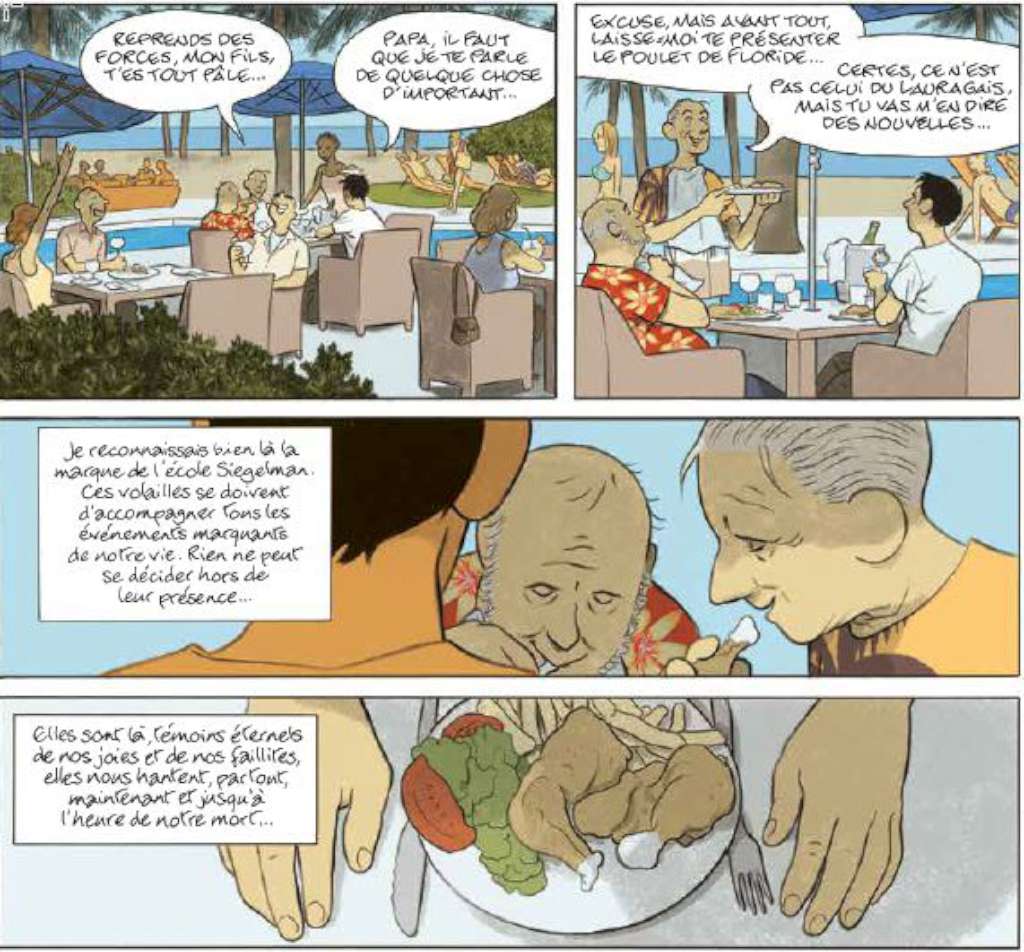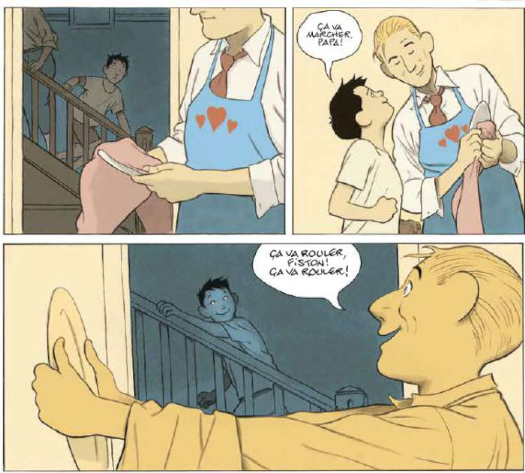 Cette figure paternelle est redupliquée également lorsque Paul devient père à son tour : jusqu’ici il se laissait porter par les événements mais grâce à son beau-fils, il trouvera l’ancrage qui lui manquait. L’adaptation de « La Vie me fait peur » rejoint ainsi les préoccupations de l’auteur du fils de Yeti (qu’il publia d’abord sous forme romanesque en 2011 avant d’ en faire un album trois ans plus tard). Il constitue donc une ode à la paternité mais pas une ode béate. Toute en nuances, au contraire, elle montre aussi comment parfois la figure paternelle peut entraver, anticipant par avance la prochaine œuvre (autobiographique) de Didier Tronchet qui s’intitulera « L’Humoriste ».