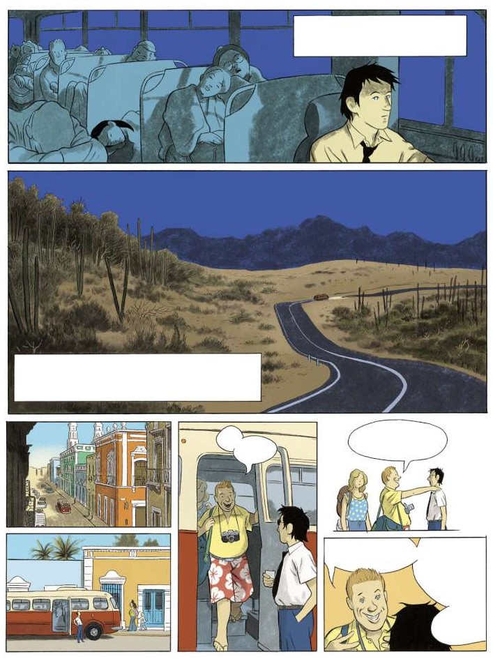 Le gaufrier n’est jamais monotone et les couleurs explosent. On passe dans une même page d’une scène nocturne dans laquelle Paul conduit de nuit un bus de touristes sur les routes du Mexique à l’explosion colorée des façades d’une ville mexicaine. On s’affranchit des cases aussi, pas de strips ni de gaufrier récurrent. Chaque page est une surprise. Durieux devient autant magicien que Raoul et se lance même un petit défi en faisant de « La vie me fait peur » sa « première bd en nuances de gris ».