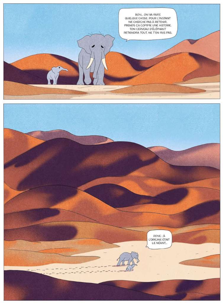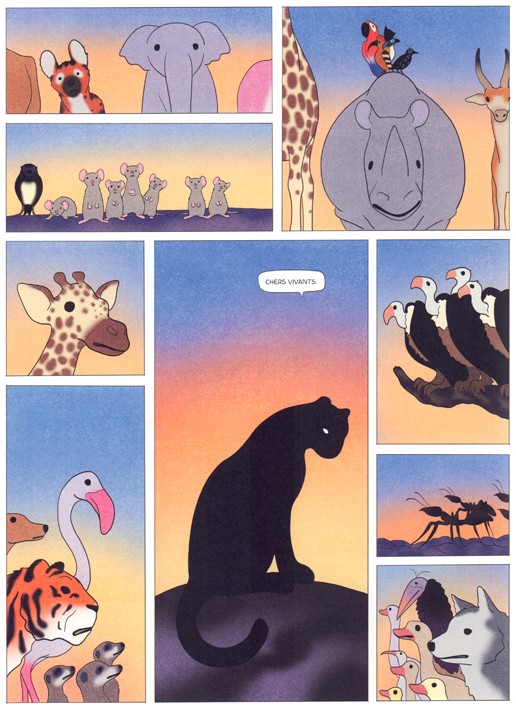 C’est ainsi que commence ce récit, formé de plusieurs histoires courtes où les animaux occupent seuls le devant de la scène. Au fil de ces récits, on suit un étourneau perdu en pleine migration, une autruche qui doute, un jeune éléphant apprenant l’histoire du monde… Cet ensemble de paraboles d’une grande force d’évocation nous replonge dans les délices des fables de La Fontaine autant que dans les images tourmentées du Livre de la Jungle. Habilement, Jérémie Moreau parvient à décentrer notre regard et à dépasser l’apologue moral humaniste ; les animaux deviennent des vivants, aux existences et aux beautés singulières.