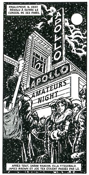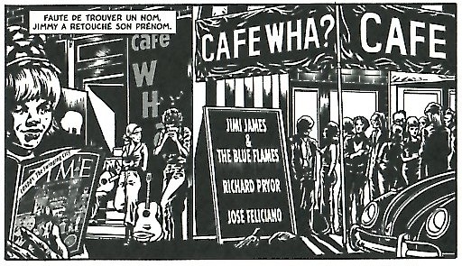 Il fallait intégrer l’époque dans le récit, donner des repères spatio-temporels au lecteur sans pour autant alourdir le propos et nuire à la fluidité du récit. Le procédé utilisé fait le job : S’inspirant de la street photography, les deux auteurs ont recréé l’époque à travers une reproduction fidèle des lieux (tels les mythiques Apollo et Café Wha?, bien sûr)…
