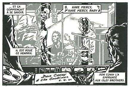 La première planche, percutante tant dans son propos s’inspirant des paroles de Belly bottom que dans son traitement graphique avec cette magistrale mis en abyme du deuxième strip, annonce la couleur en nous faisant d’emblée pénétrer dans la psyché tourmentée de Jimi Hendrix.