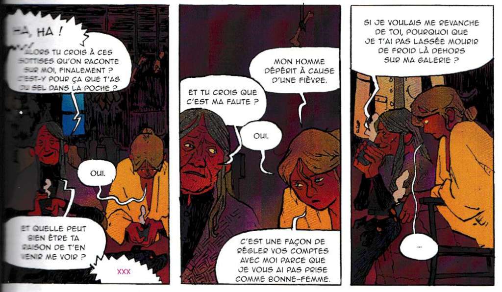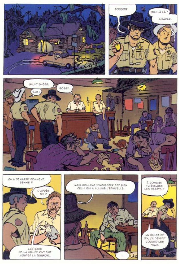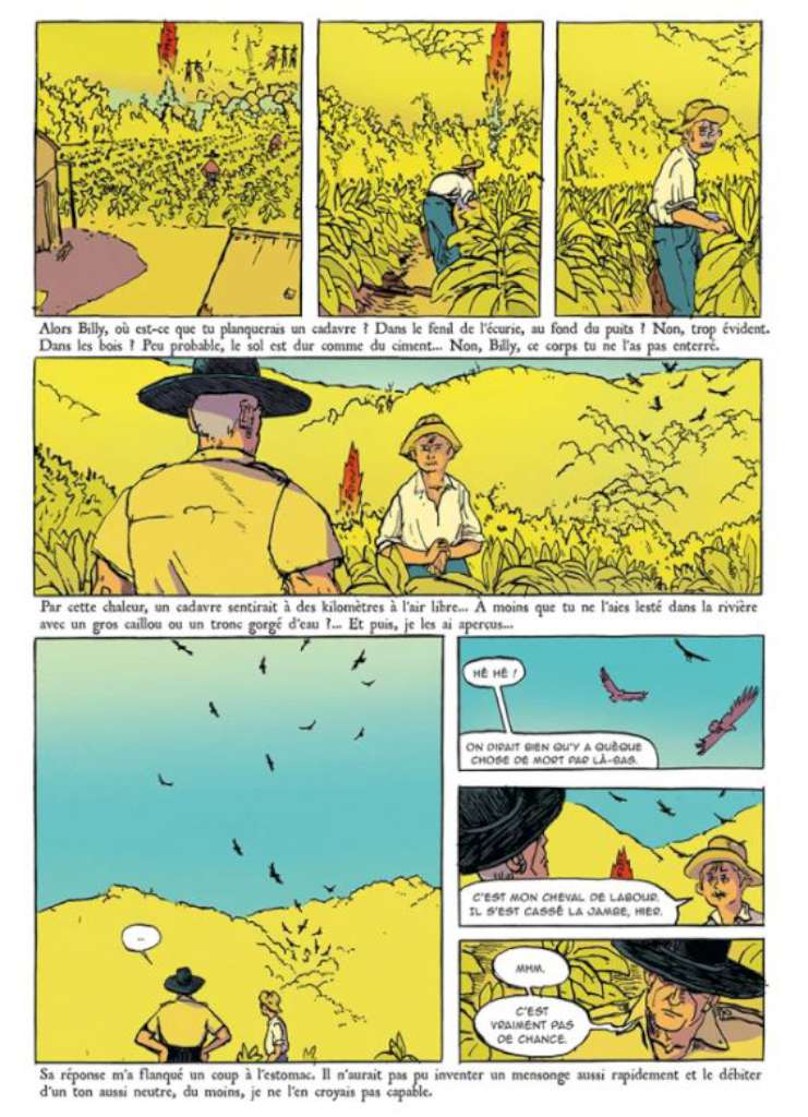 Comme un équivalent graphique aux caractéristiques du « parler » de chacun, Michele Foletti a en outre choisi d’attribuer une couleur à chacun des protagonistes : ainsi, le chapitre narré par le shérif est dans les dominantes de jaune, celui consacré à Amy dans les rouges, celui de Billy plutôt vert et celui d’Isaac dans des camaïeux de bleu. Cette approche synesthésique rend alors également l’adaptation poétique.