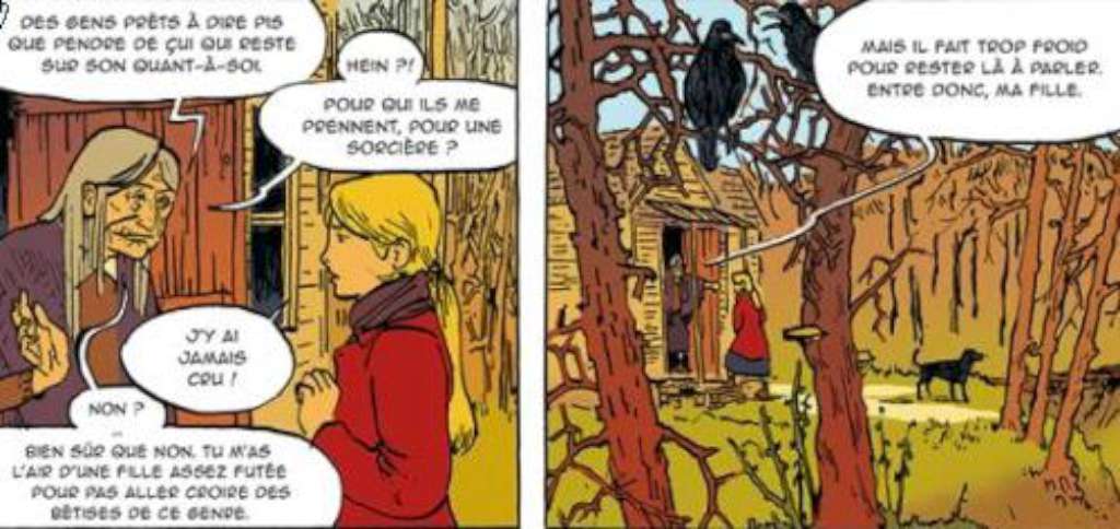 Ces voix, il fallait que les lecteurs de l’album puissent aussi les entendre. Michele Foletti a tâtonné quelque temps avant de trouver le moyen de les inclure sous les cases en insérant des extraits de l’œuvre initiale. Ceux-ci forment comme un monologue intérieur, un sous-texte qui accompagne ou dément les propos tenus dans les dialogues. Cette voix off ainsi créée sert également de fil rouge au lecteur qui peut alors confronter les points de vue, démêler le vrai du faux, reconstituer le puzzle.