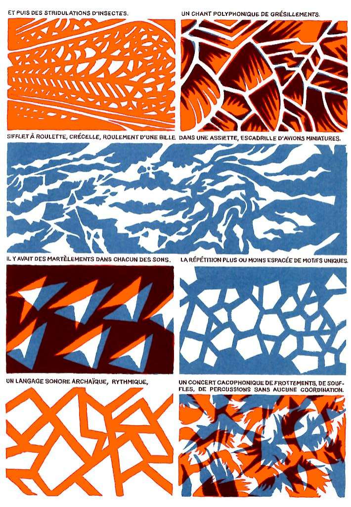 Pas de bulles donc et pas de trait de contour non plus dans le dessin mais des masses orange, bleues qui se superposent pour donner naissance à un dessin tissé de textures animales, végétales, minérales qui s’enchevêtrent.